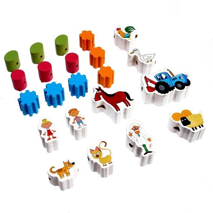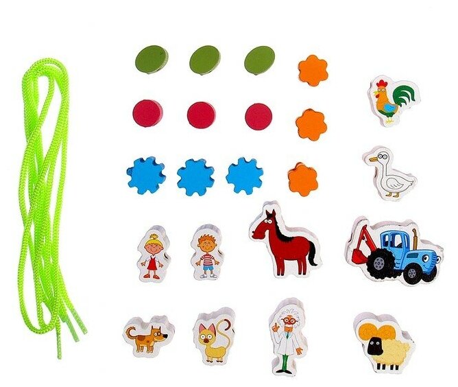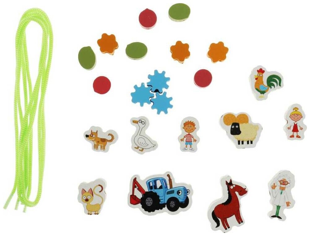 Маленький любознайка будет с удовольствием играть с красочными деревянными фигурками разной формы, в том числе в виде героев популярного мультсериала. Малыш научится делать из них яркие бусы, просовывая шнурок в специальное отверстие и чередуя элементы по своему вкусу и желанию.