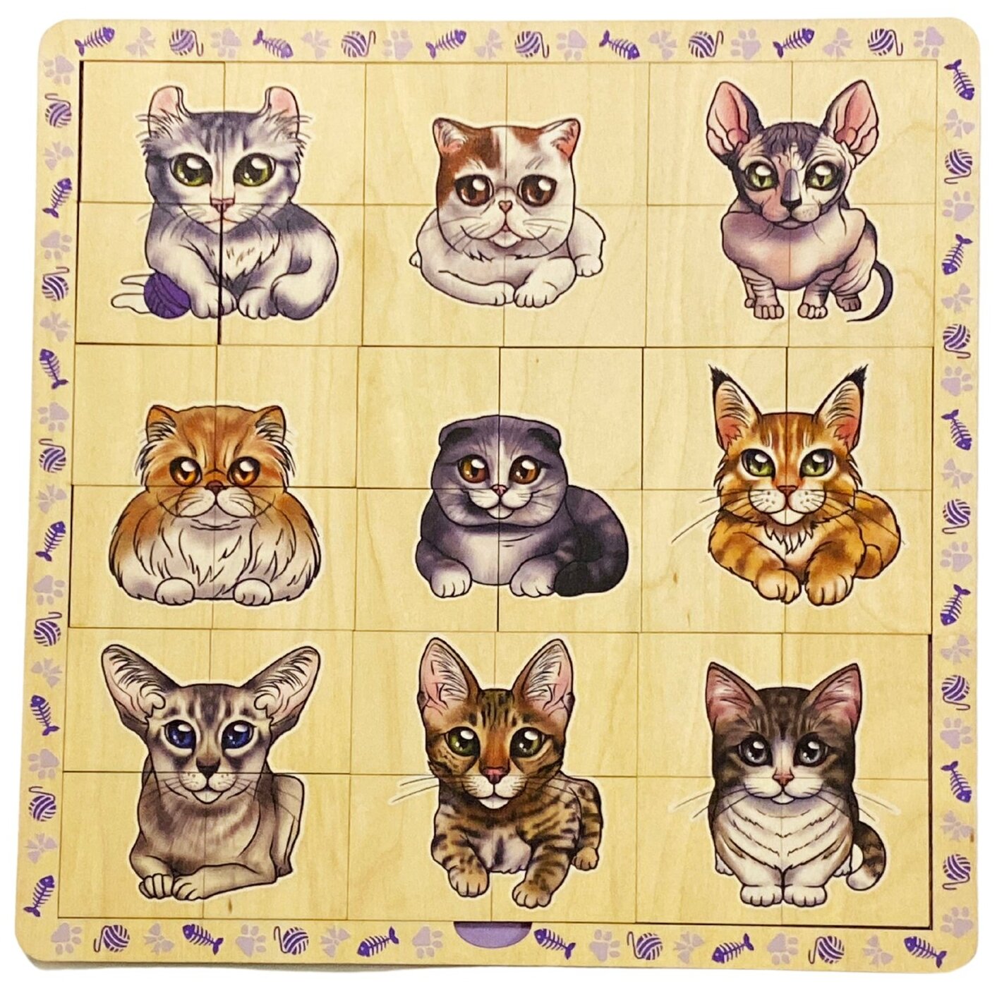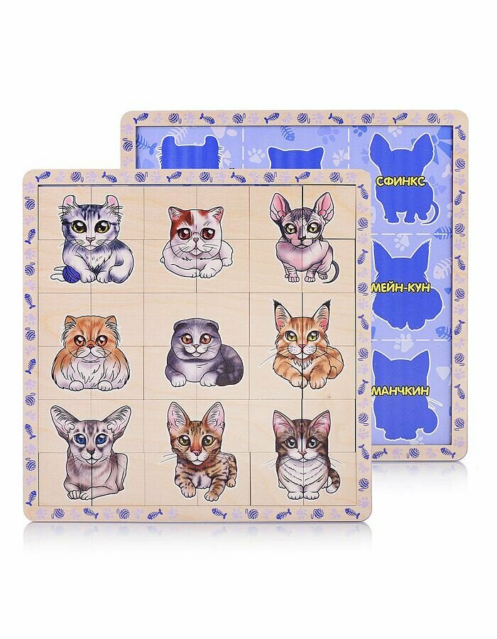 Внешний слой пазла-сортера представляет собой 36 деталей, на которых нанесены изображения девяти кошек различных пород. На подложке (внутренний слой) нанесены силуэты кошек и названия пород. Попросите вашего ребенка собрать изображения кошек (одно изображение состоит из четырех частей), используя при необходимости силуэты в качестве подсказки.