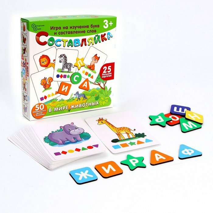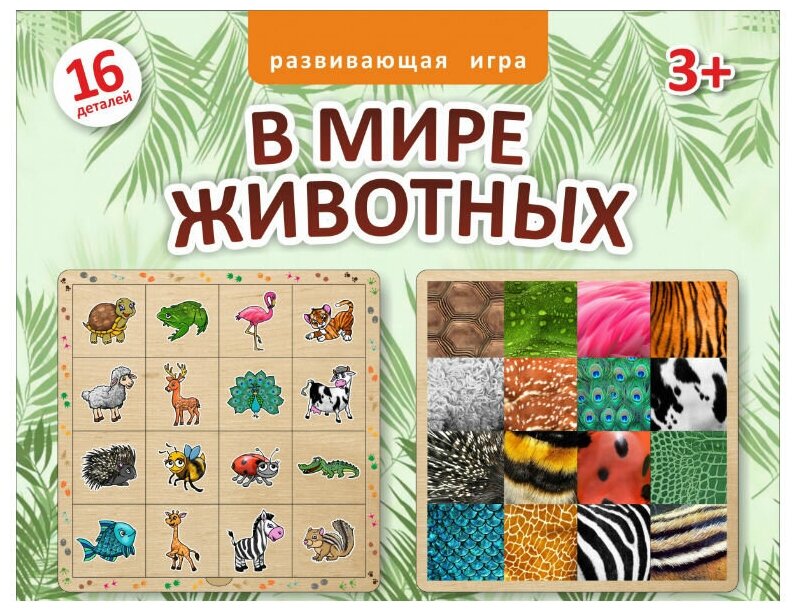 В мире животных - игра на внимательность и наблюдательность. Игра состоит из игрового поля-подложки и 16 квадратных пластинок-вкладышей. На вкладышах изображены различные животные. Подложка разбита на 16 квадратов, каждый квадрат окрашен в соответствие с окраской одного из животных. Задача ребенка - соотнести окрас животного с самим животным и разместить все вкладыши с животными на своих местах.