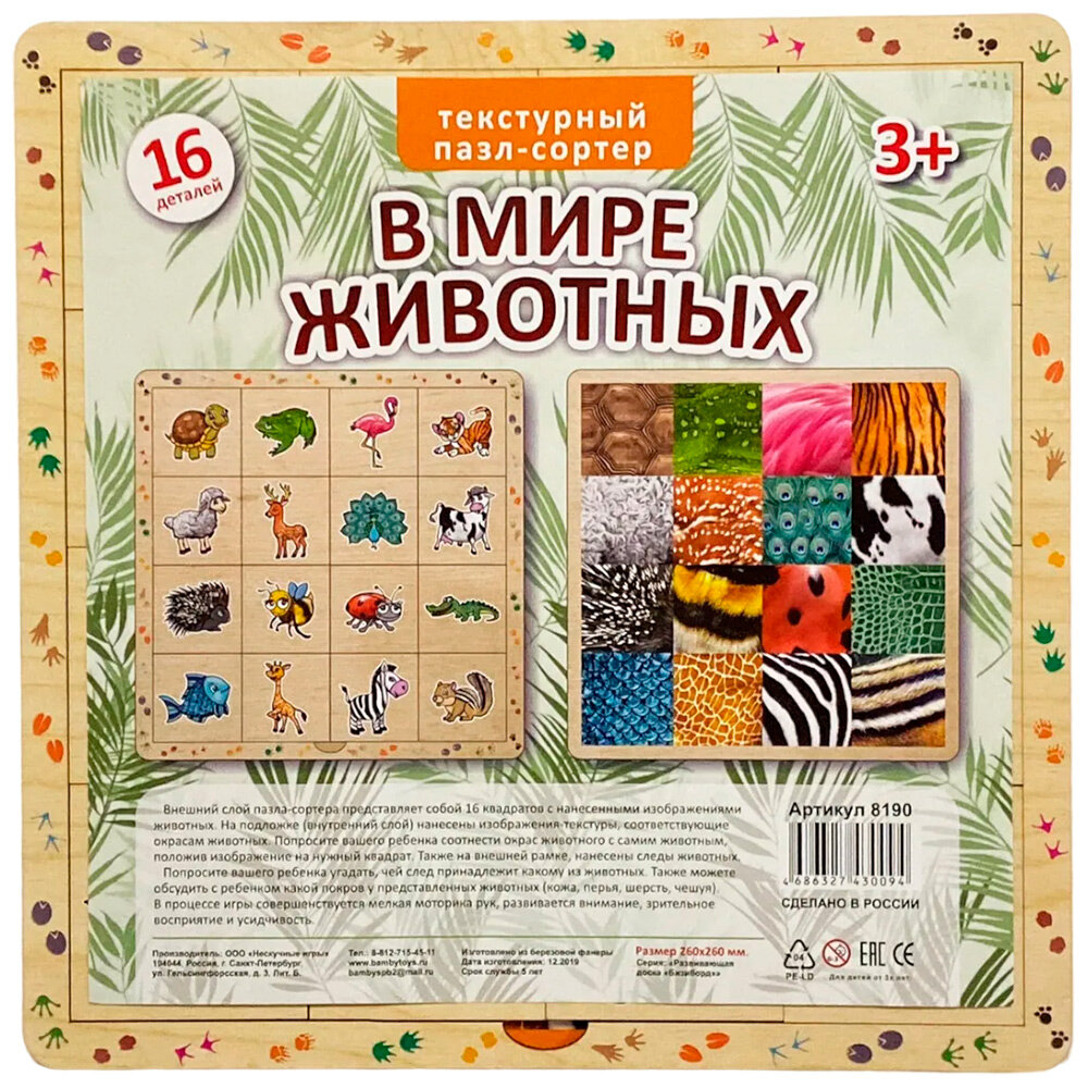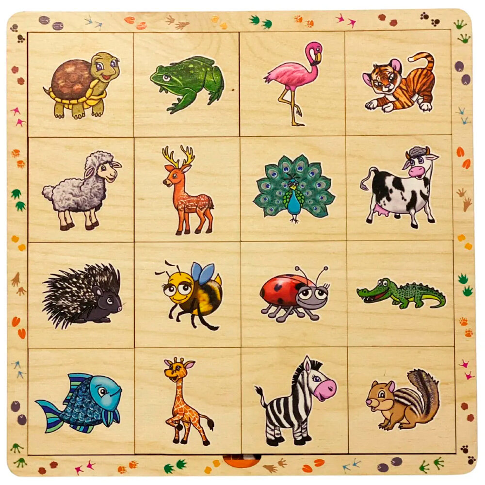 Также на боковой рамке изображены следы, можно попробовать догадаться, какому животному какие следы принадлежат. Такая игра развивает внимательность и усидчивость. Расширяет кругозор и словарный запас ребенка. Размер игры: 26х26 см Материал: фанера Упаковка: прозрачная пленка