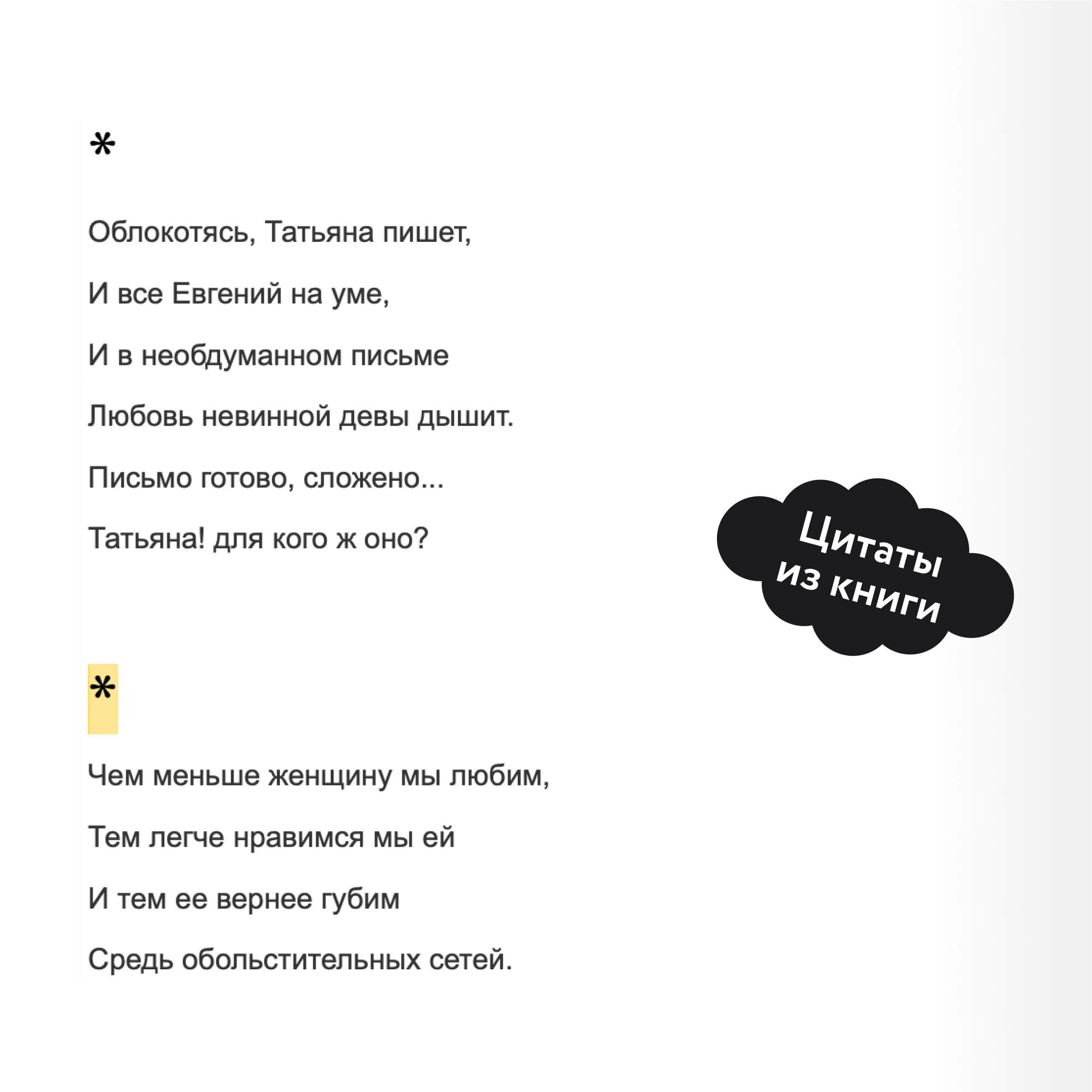 Самое любимое моё произведение! Роман в стихах легко читается, охватывает большой временной период, раскрывает жизнь людей 19 века: их интересы, увлечения, моду, ценности. Простой сюжет с любовной линией, глубина характеров персонажей, лёгкий слог делают это произведение притягательным для читателя. Его хочется читать снова и снова, по-новому открывать для себя героев, причины их поступков.