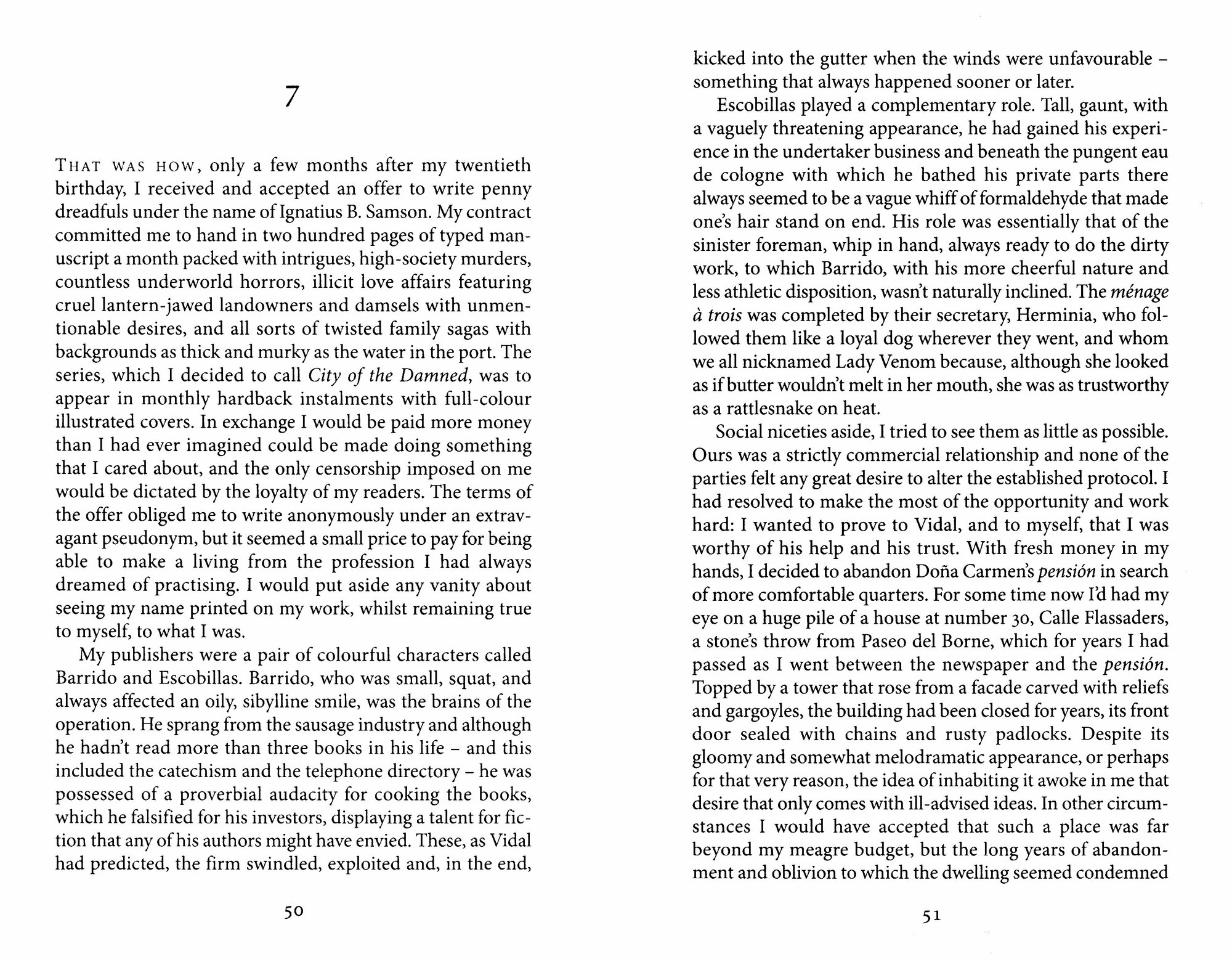 In an abandoned mansion at the heart of Barcelona, a young man – David Martin – makes his living by writing sensationalist novels under a pseudonym. The survivor of a troubled childhood, he has taken refuge in the world of books, and spends his nights spinning baroque tales about the city’s underworld. But perhaps his dark imaginings are not as strange as they seem, for in a locked room deep within the house letters hinting at the mysterious death of the previous owner. Like a slow poison, the history of the place seeps into his bones as he struggles with an impossible love.