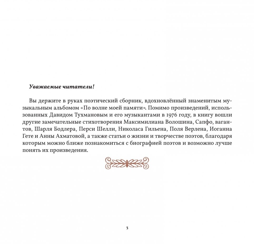 Настоящее издание — это поэтический сборник, вдохновленный одноименным музыкальным альбомом «По волне моей памяти», вышедшим в 1976 году. В нем собраны биографии и яркие стихотворения Максимилиана Волошина, Сапфо, Шарля Бодлера, Перси Шелли, Николаса Гильена, Поля Верлена, Иоганна Гете, Анны Ахматовой и сочинения вагантов.