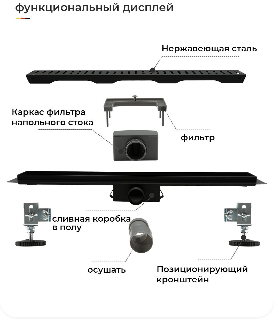 | Комплектация | Трап, ножки, решетка, затвор, упаковка; гидрозатвор; грязеуловитель |