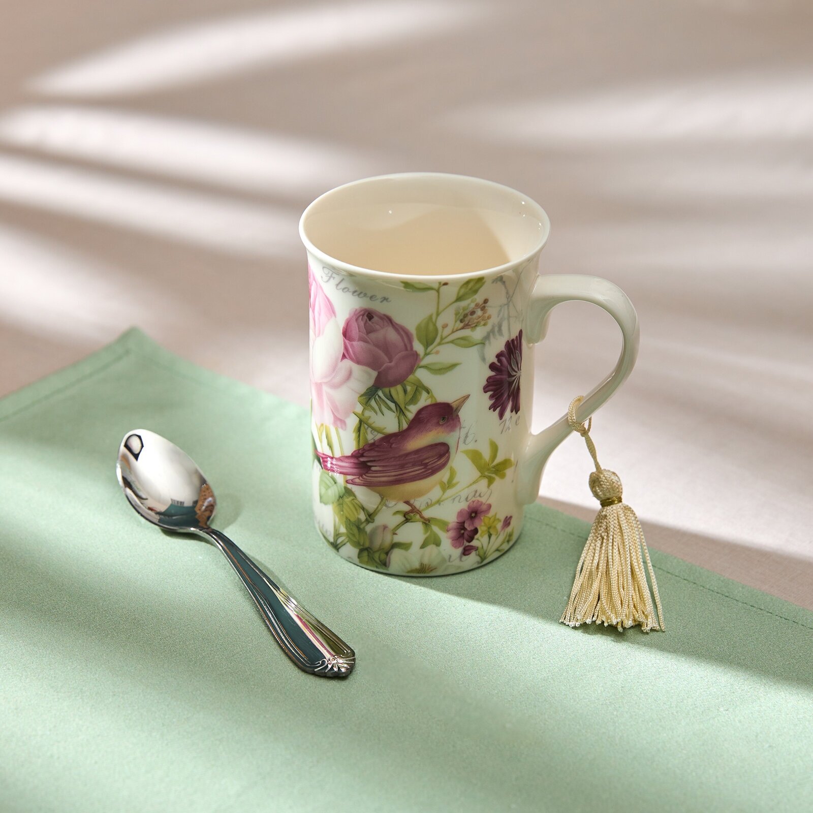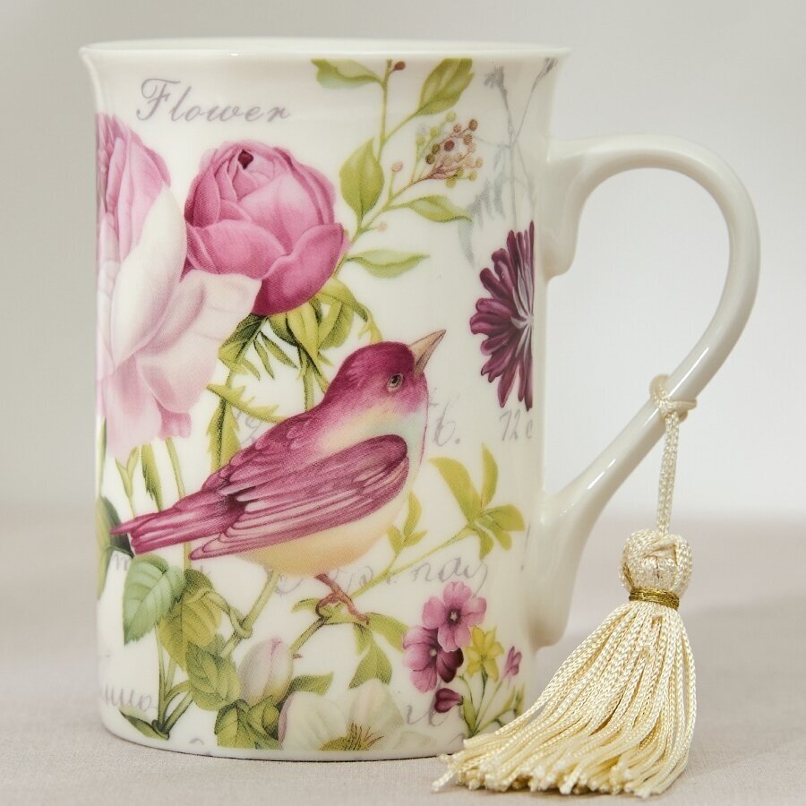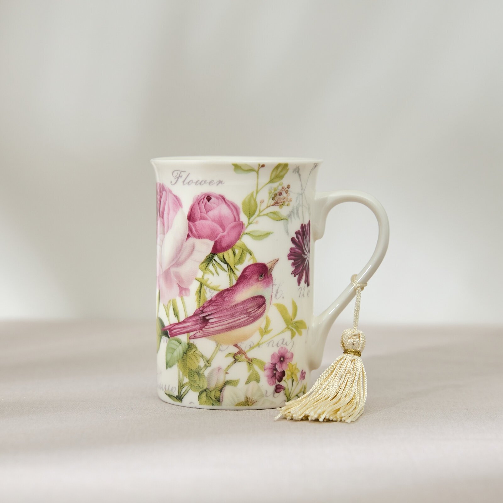 Фарфоровая кружка от Cozy Home объемом 320 мл, белого цвета с изысканным принтом - розовыми цветами и птицами. Кружка упакована в подарочную плотную коробку.