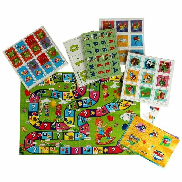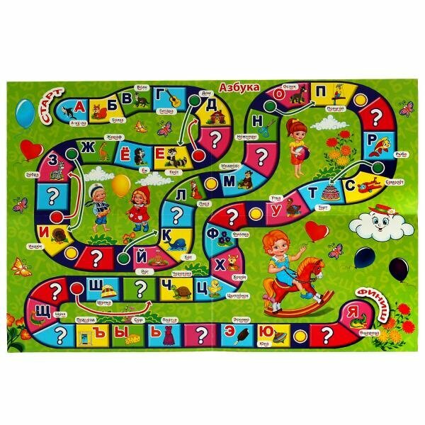 - игра азбука-ходилка (игральный кубик и 4 фишки в комплекте): кидаем кубик и устремляемся к финишу, изучая в процессе буквы