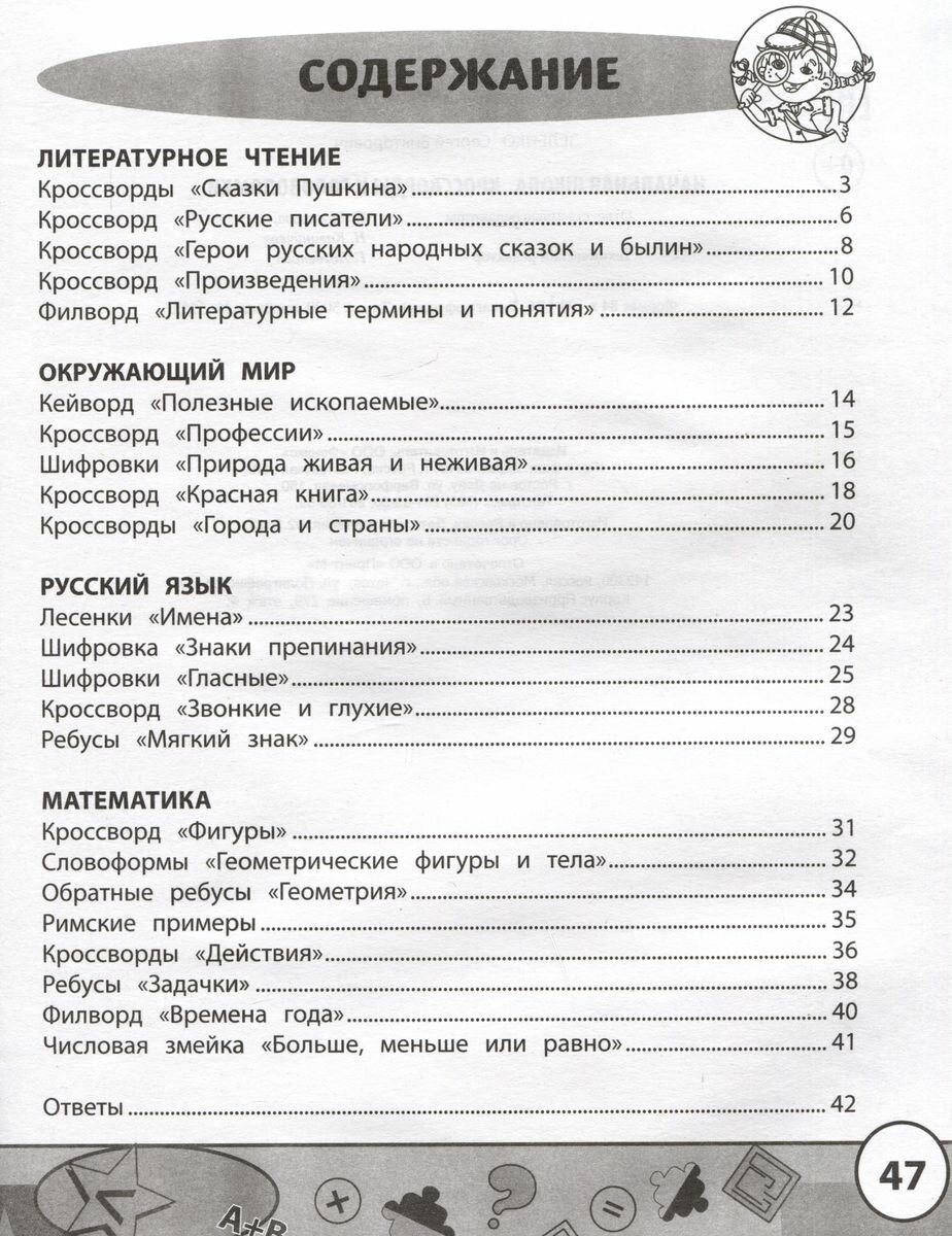 Сборник занимательных заданий включает специально разработанные игровые упражнения, шифровки, головоломки и кроссворды для отработки учениками начальной школы знаний, умений и навыков по литературе, русскому языку, окружающему миру, математике. Задания помогут четвероклассникам без лишних усилий запомнить правила, повторить имена писателей и их произведения, полезные ископаемые и столицы государств, правила орфографии и пунктуации, арифметические действия, усвоить математические закономерности. Представленные упражнения можно использовать как на уроках, так и в качестве домашних заданий, на стимулирующих и поддерживающих занятиях, как олимпиадные задания.