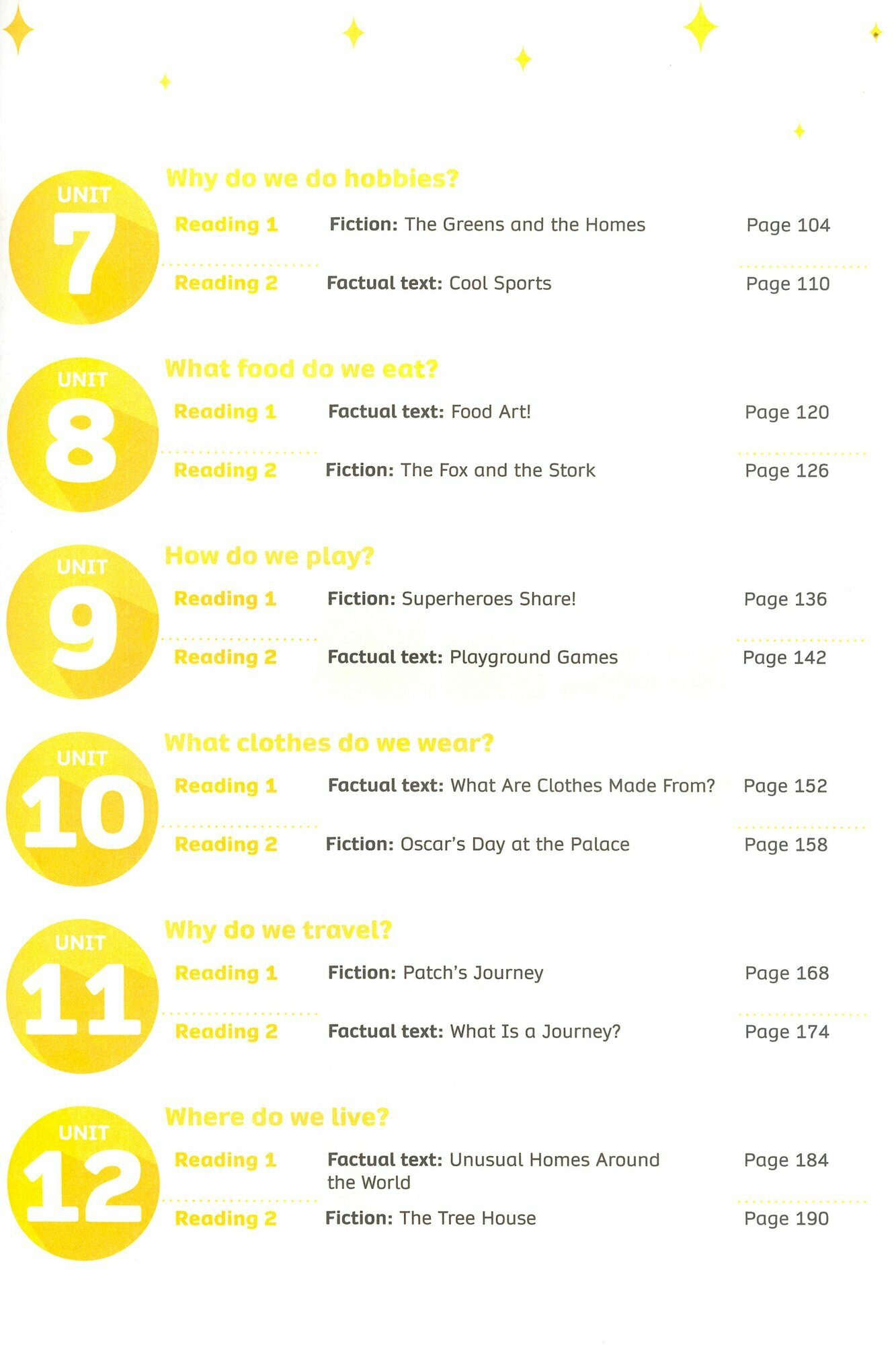 Two reading texts are included per unit: one fictional (presenting values) and one factual (helping students learn about the world).