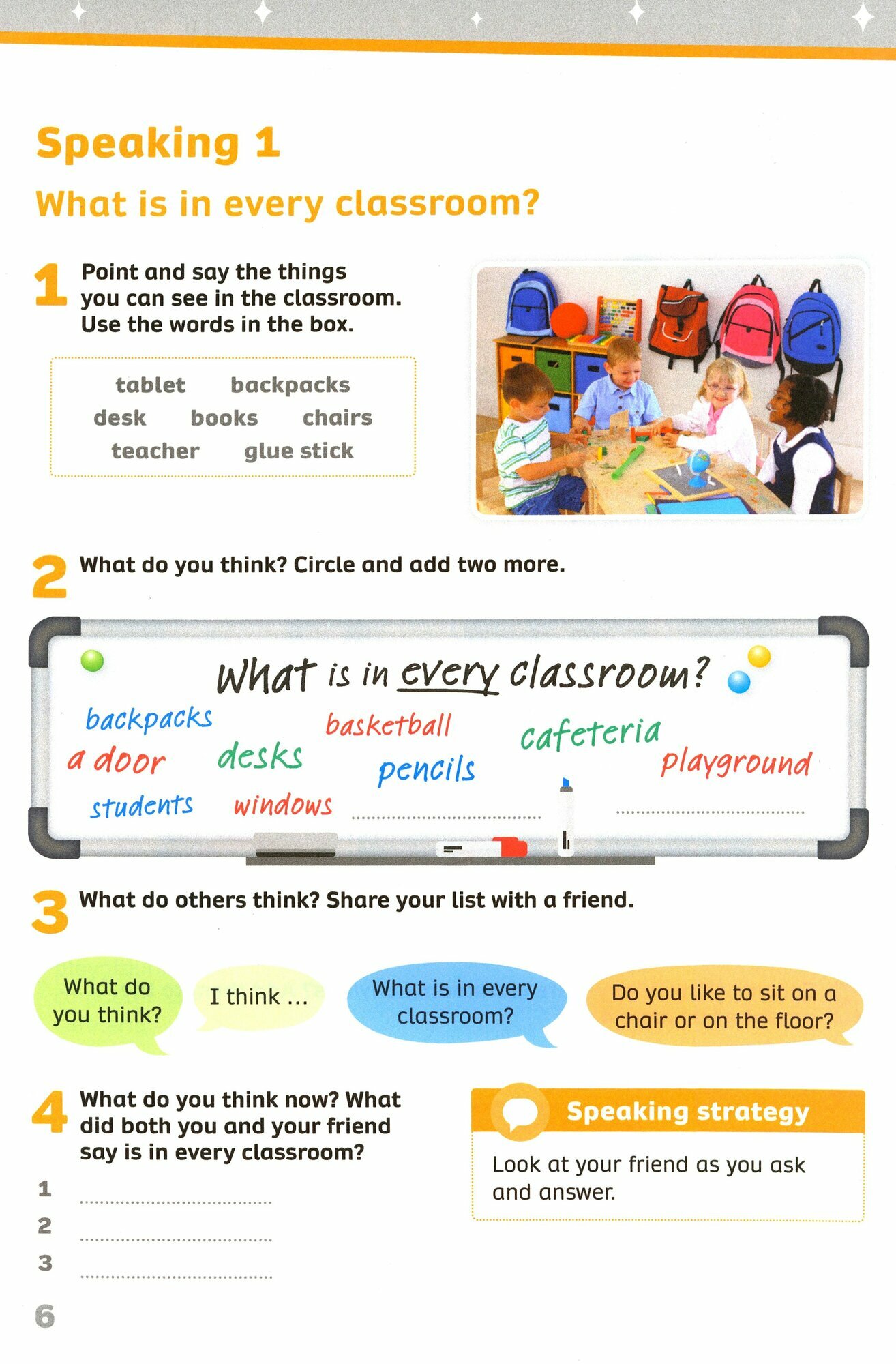Speaking strategies from Level 1 help students develop all aspects of communication from the earliest stages of learning English.