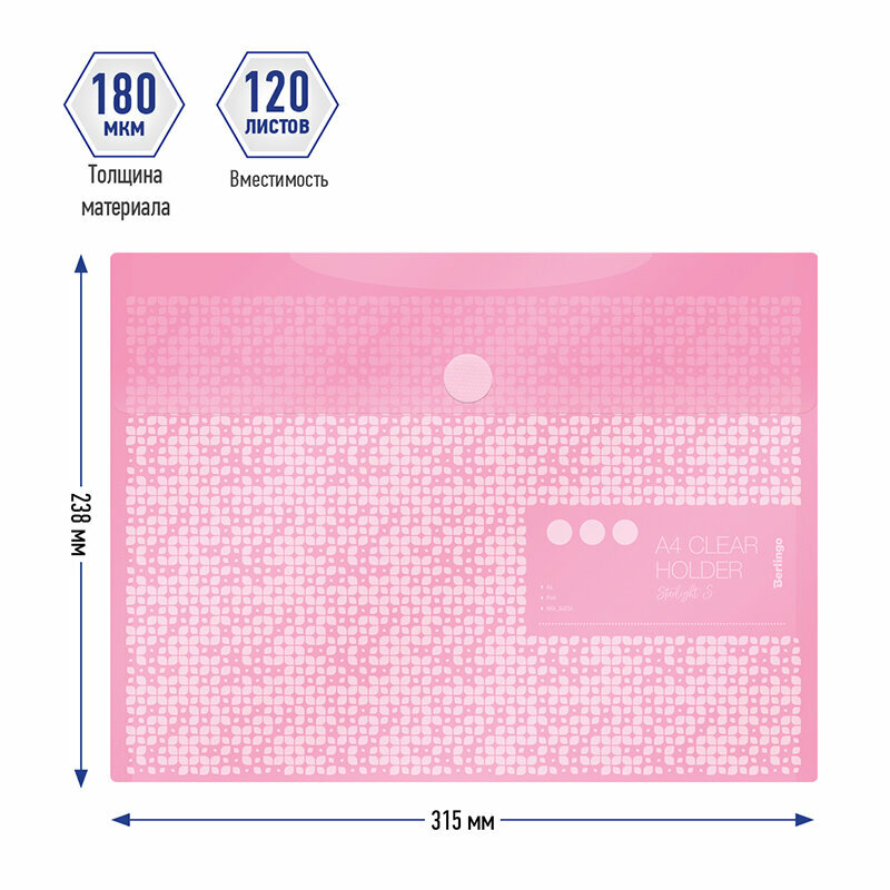 Папка-конверт на липучке Berlingo серии Starlight S формата А4 - стильный и яркий аксессуар для офиса и учёбы голубого цвета. У папки полупрозрачная обложка толщиной 180 мкм. Размер папки составляет 315*238 мм., ориентация – горизонтальная. Папка плотно закрывается на липучку, защищая документы от повреждений и загрязнений.