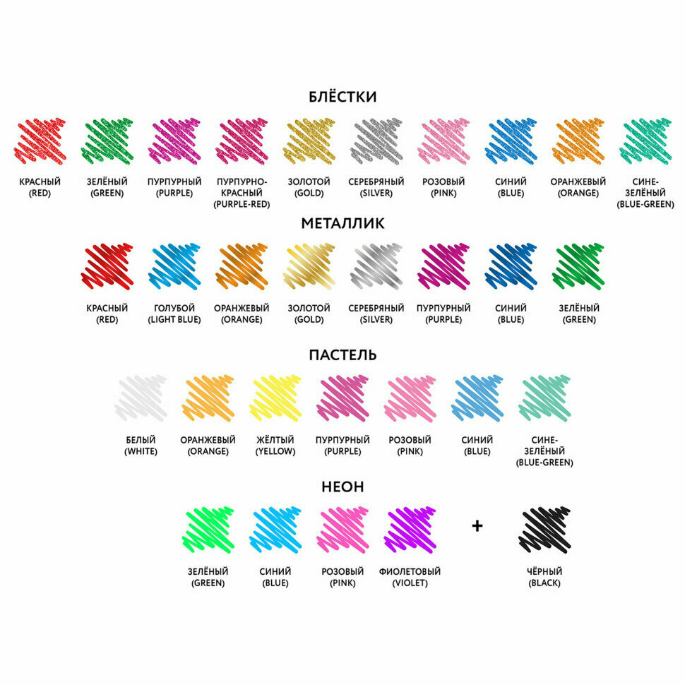 Цвета чернил с блестками: золотой, красный, пурпурный, синий, зеленый, розовый, пурпурно-красный, оранжевый, серебряный, сине-зеленый.