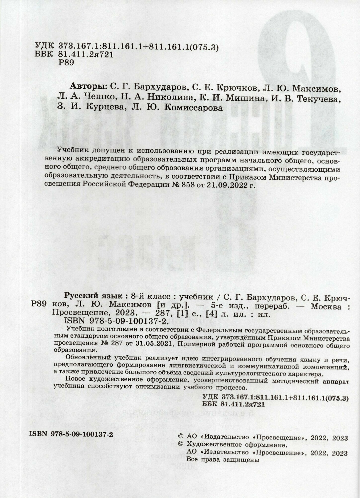 Русский язык. 8 класс. Учебник. ФГОС (Бархударов С. Г., Крючков С. Е., Максимов Л. Ю., Чешко Л. А., Николина Н. А., Мишина К. И., Текучева И. В., Курцева З. И., Комиссарова Л. Ю.); Просвещение, 2023