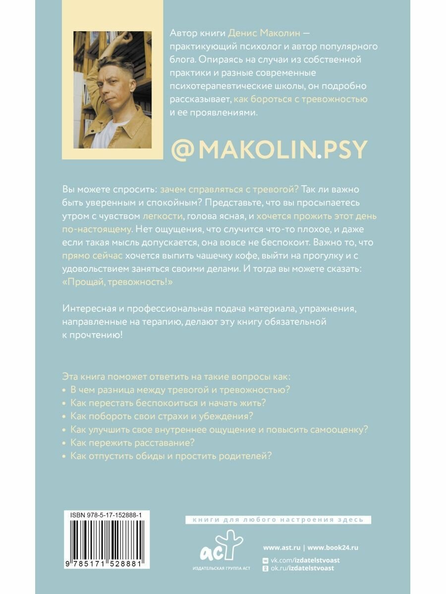 Автор книги Денис Маколин - практикующий психолог и автор популярного блога. Опираясь на случаи из собственной практики и разные современные психотерапевтические школы, он подробно рассказывает, как бороться с тревожностью и ее проявлениями.