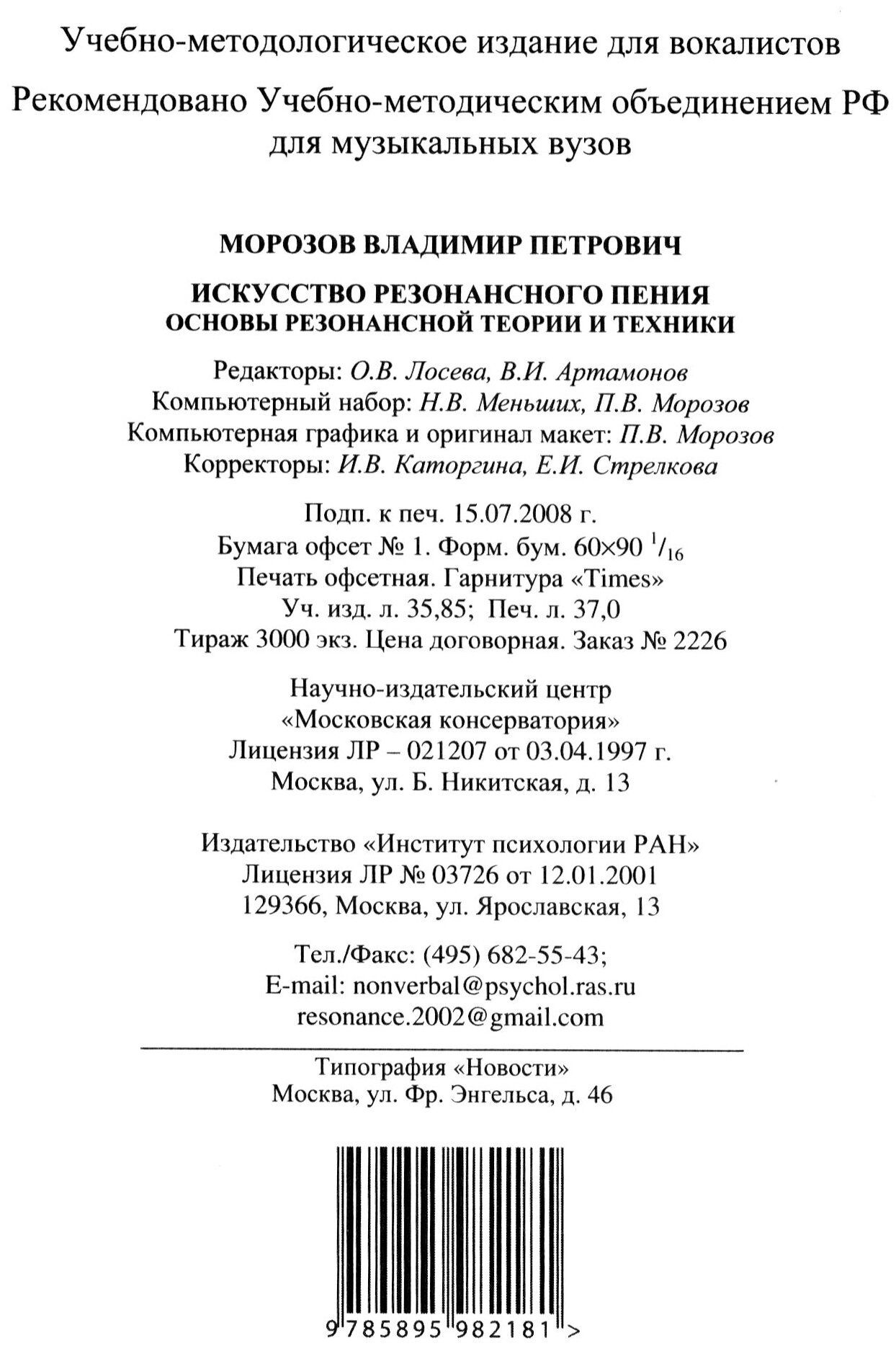 Искусство резонансного пения. Основы резонансной теории и техники (Морозов Владимир Петрович); Институт психологии РАН, 2008