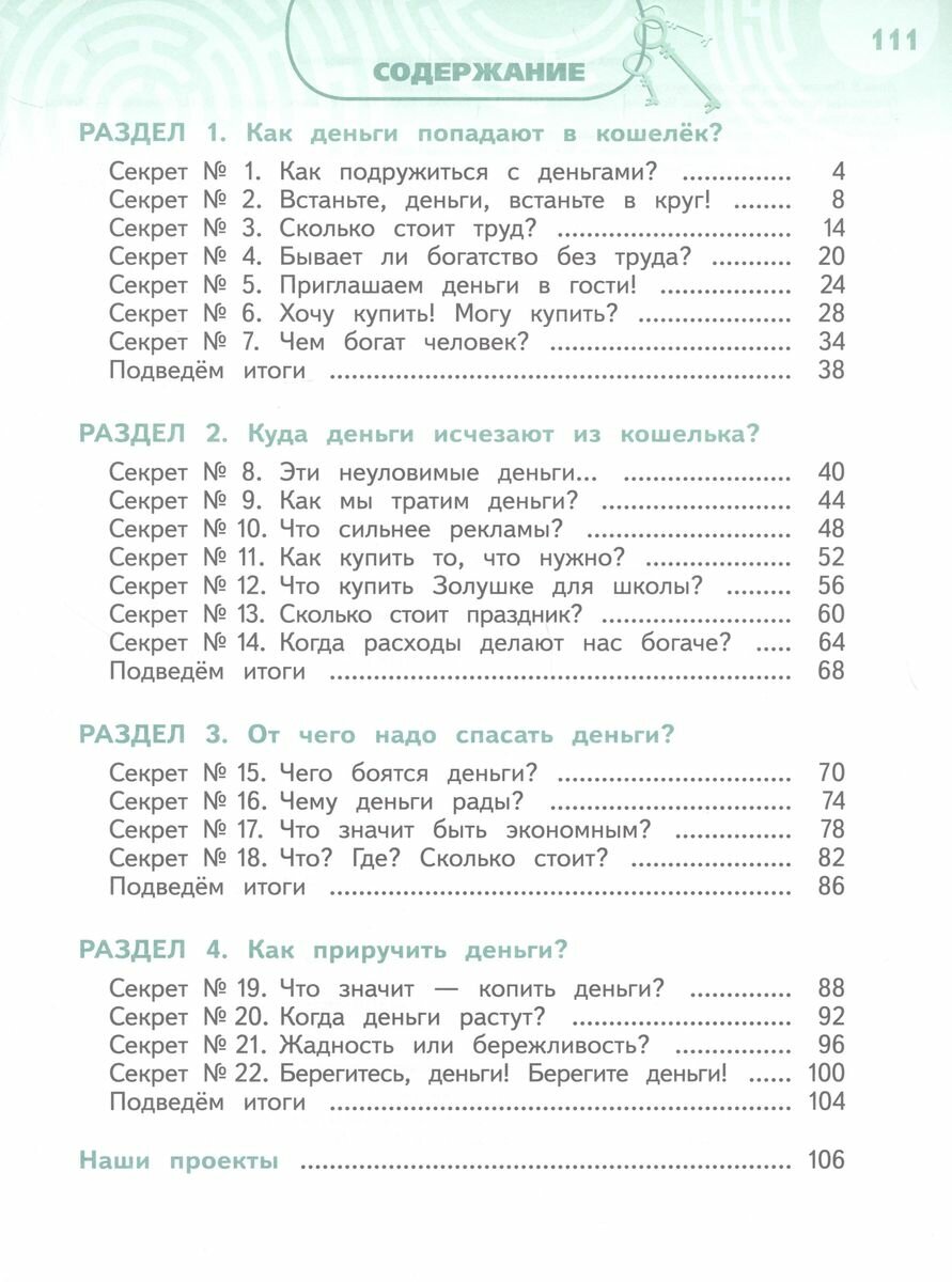 Учебник соответсвует ФГОС 2021 г. Учебник «Обществознание. Секреты финансовой грамоты. 3 класс» предназначен для учащихся начальной школы. Материал учебника обеспечивает формирование у младших школьников базовых финансовых понятий и компетенций с помощью доступных примеров и реальных ситуаций из жизни. Пособие поможет осознанию учащимися важности финансовой сферы жизни человека, научит детей ответственно относиться к деньгам и грамотно ими распоряжаться, объяснит взаимосвязь труда и его стоимости, сформирует основу для разумного принятия финансовых решений. Содержание учебника включает схемы, графики, таблицы, диаграммы, задания для развития проектно-исследовательских умений. Система заданий способствует воспитанию у обучающихся морально-волевых качеств и нравственно-этических установок. Учебник соответствует требованиям Федерального государственного образовательного стандарта начального общего образования.