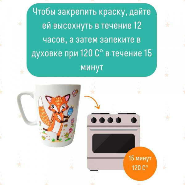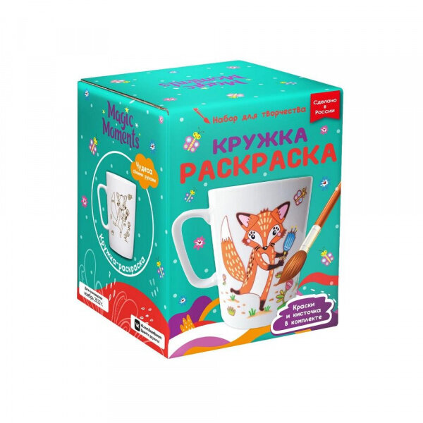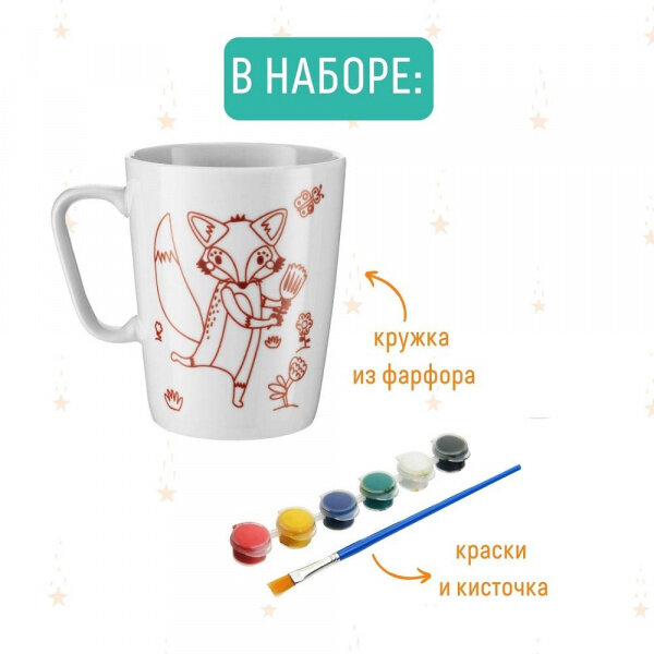 Кружка-раскраска – удивительный набор для творчества, ведь это одновременно и увлекательное занятие и прекрасный сувенир. Кружка, раскрашенная собственными руками, станет достойным подарком близким или займет почетное место в коллекции. Кружка выполнена из качественного фарфора и очень приятная на ощупь. Краски и кисточка входят в комплект.Кружку можно раскрасить краской из набора. При необходимости краску можно смывать и раскрашивать заново. Если вы хотите, чтобы краска закрепилась, ей нужно дать высохнуть в течение 12 часов, а затем поставить кружку в духовой шкаф на 15 минут при температуре 120 градусов. После этого краска закрепится. Мы не рекомендуем мыть кружку в посудомоечной машине или использовать агрессивные моющие средства. В наборе: кружка из фарфора, краски и кисточка.