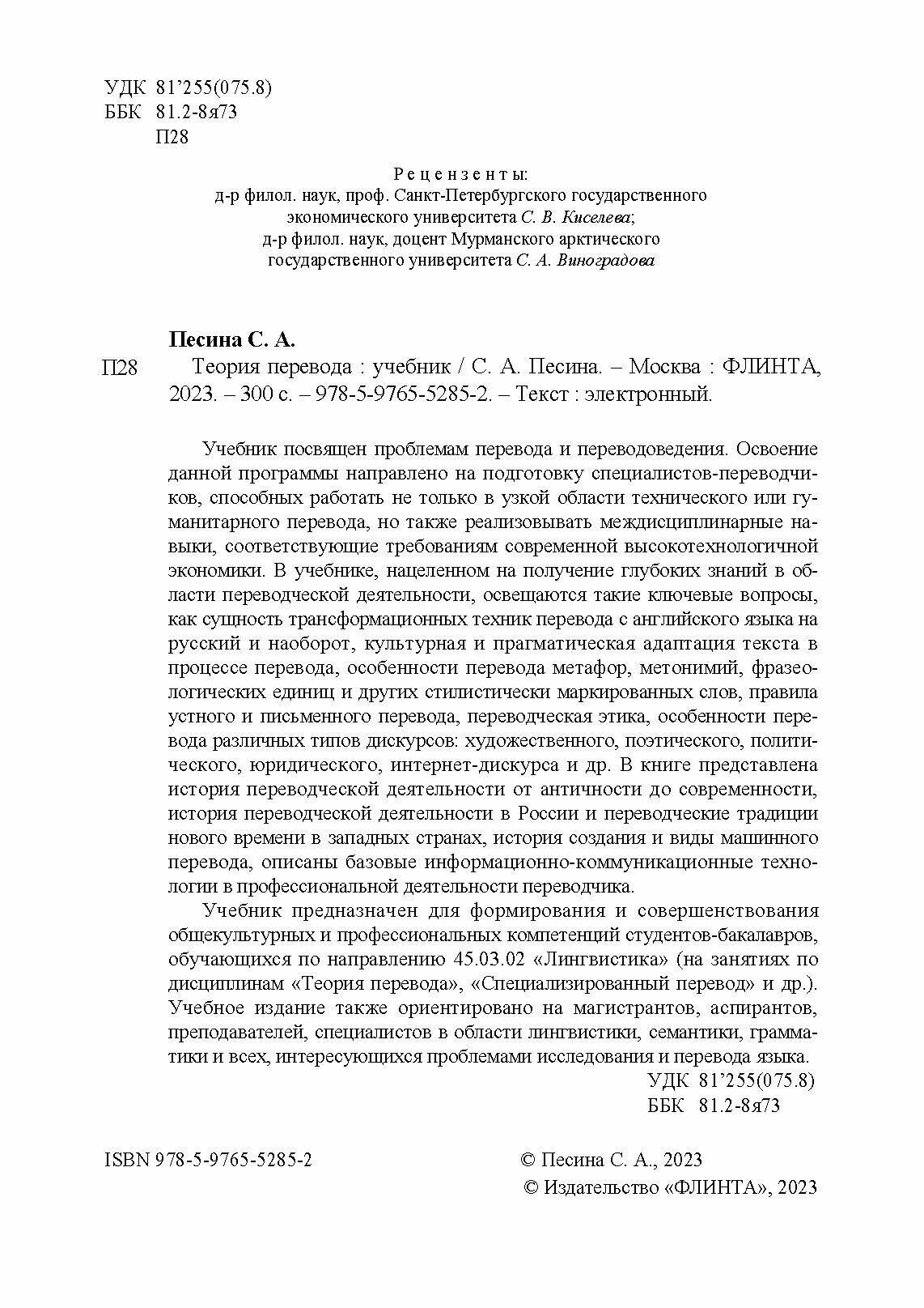Книга: Теория перевода. Учебник (Светлана Андреевна Песина); Флинта, 2023