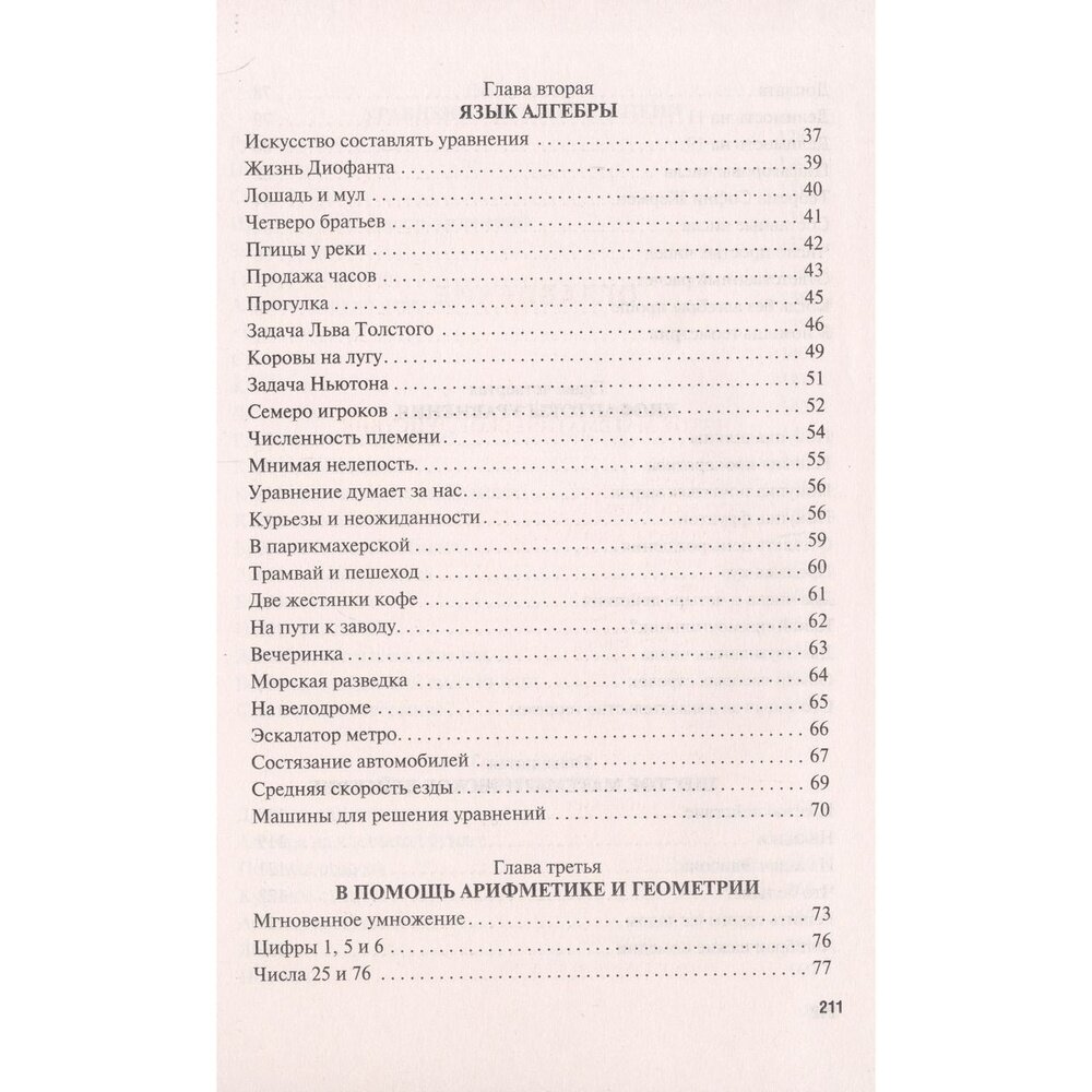 Порой кажется, что алгебра – чудной, непонятный зверь, который так и норовит покусать и оставить в дневнике следы в виде колов да двоек? Это совсем не так! Алгебра и не зверь вовсе, а очень даже увлекательная наука. Другое дело, что не каждый сможет рассказать о ней так же захватывающе, как Яков Исидорович Перельман, математик и знаменитый популяризатор науки. С ним мы отправимся в удивительное «алгебраи-ческое» путешествие: станем разведчиками, познакомимся с любителями головоломок из Древней Индии, узнаем секрет горения огня и слетаем на Луну.