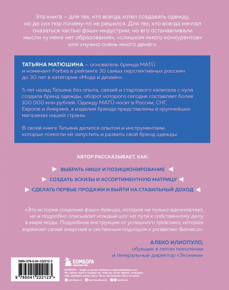 «Это история создания фэшн-бренда, которая не только вдохновляет, но и подробно описывает каждый шаг на пути к собственному делу в мире моды. Эта книга — подробная инструкция от успешного практика, которая заряжает своей энергией и системным подходом к развитию бизнеса».