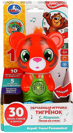 Очаровательный тигрёнок с головой-трещоткой и световыми эффектами непременно понравится Вашему малышу и займет его на долгое время. Ребёнок с удовольствием будет слушать песни на замечательные стихотворения Самуила Маршака, весёлые песенки из мультфильмов и забавные звуки.