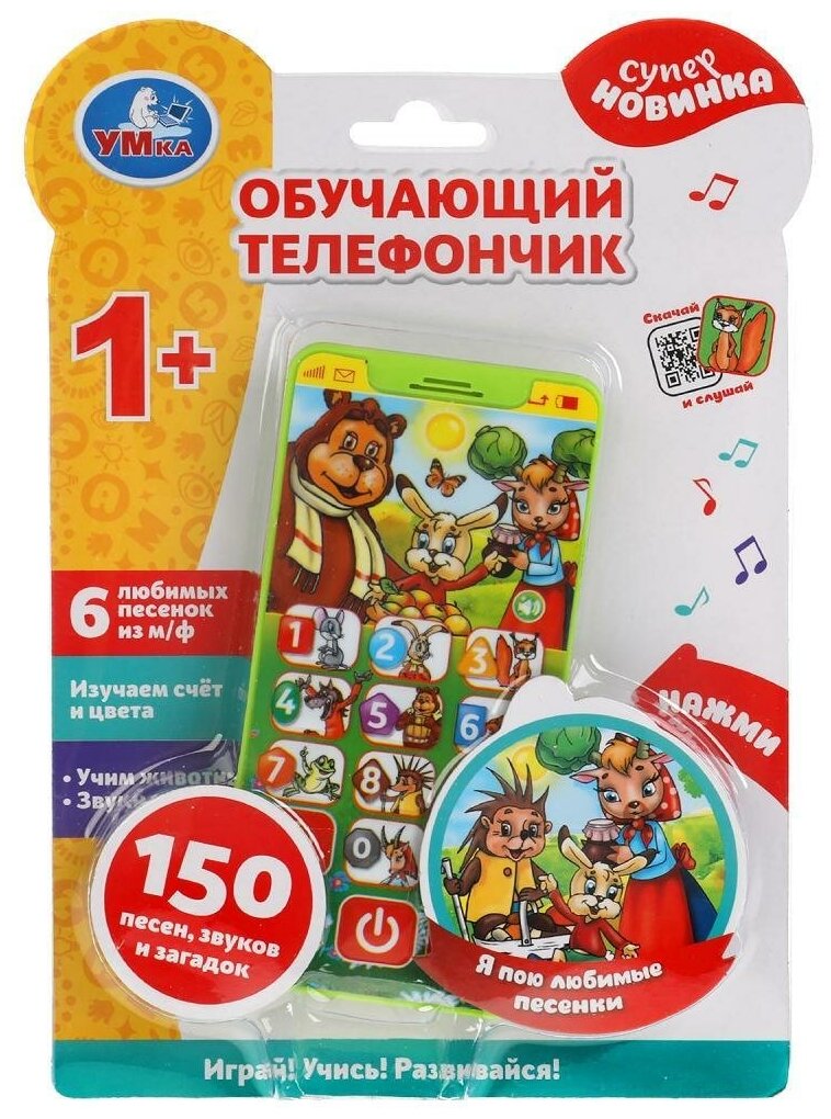 Умка Обучающий телефон со светом «В. Сутеев. Сказки» ТМ «УМка» непременно понравится малышу: 100 песен, загадок и заданий 5 песен из м/ф 3 сказки В. Сутеева учим названия и голоса животных цифры, формы и цвета Яркий телефон сделает обучение малыша лёгким и интересным. Он с удовольствием будет нажимать на разноцветные кнопочки и слушать весёлые песенки и интересные сказки. Компактную игрушку удобно брать с собой. Обучающий телефон ТМ «УМка» развивает: память слуховое восприятие и музыкальный слух тактильные навыки визуальное восприятие моторику Размер игрушки: 15 x 8 x 3 см. Материал: пластмасса. Работает от 3-х батареек типа ААА (в комплекте). Рекомендовано детям от 3-х лет.