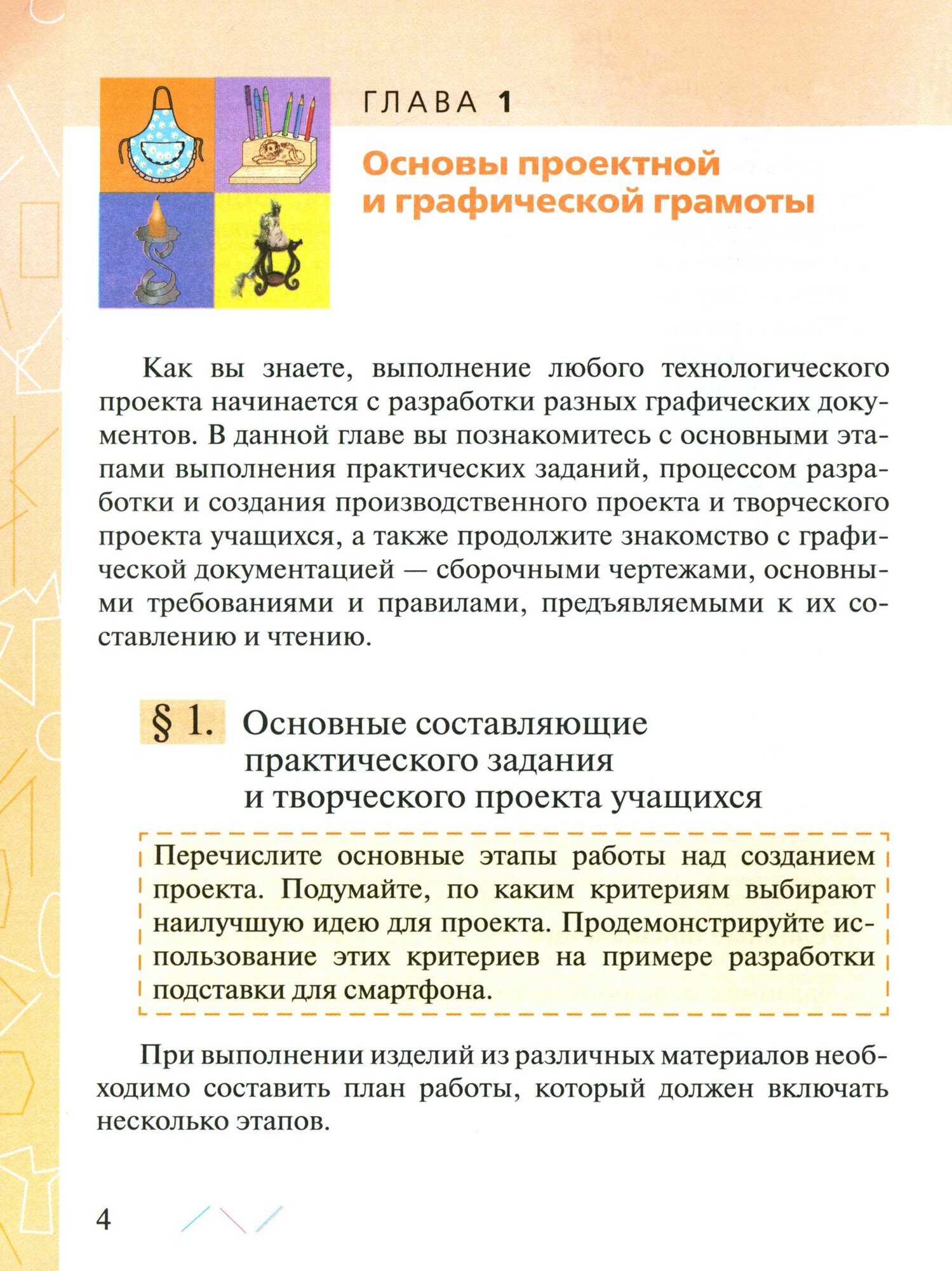 Методический аппарат учебника составляют вопросы для самопроверки, система задании, включающих исследовательские, графические, практические задания, темы проектов, задания с использованием Интернета. Учебник содержит рубрику "Полезная информация", в которую помещён дополнительный материал, словари профессий и основных понятий и терминов.