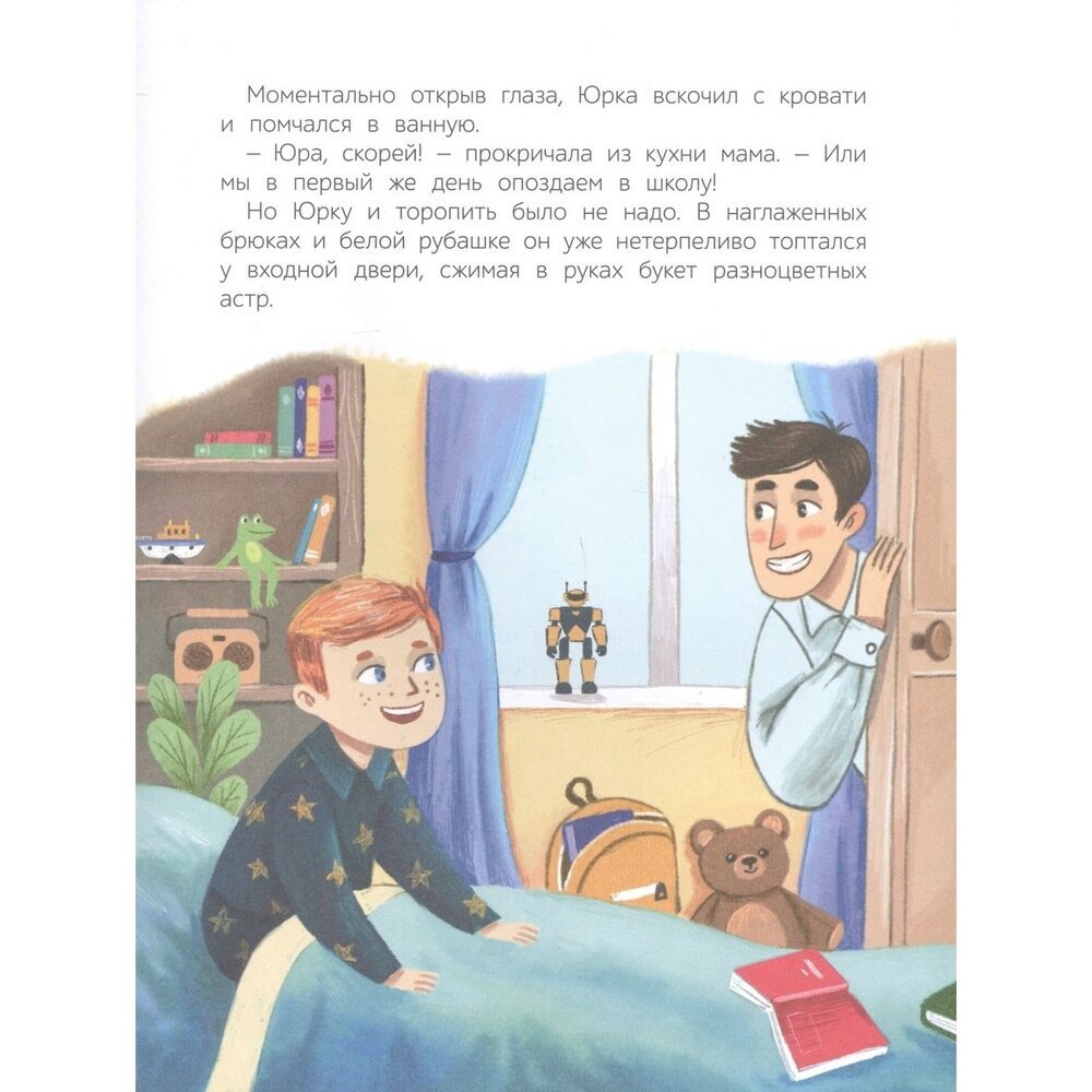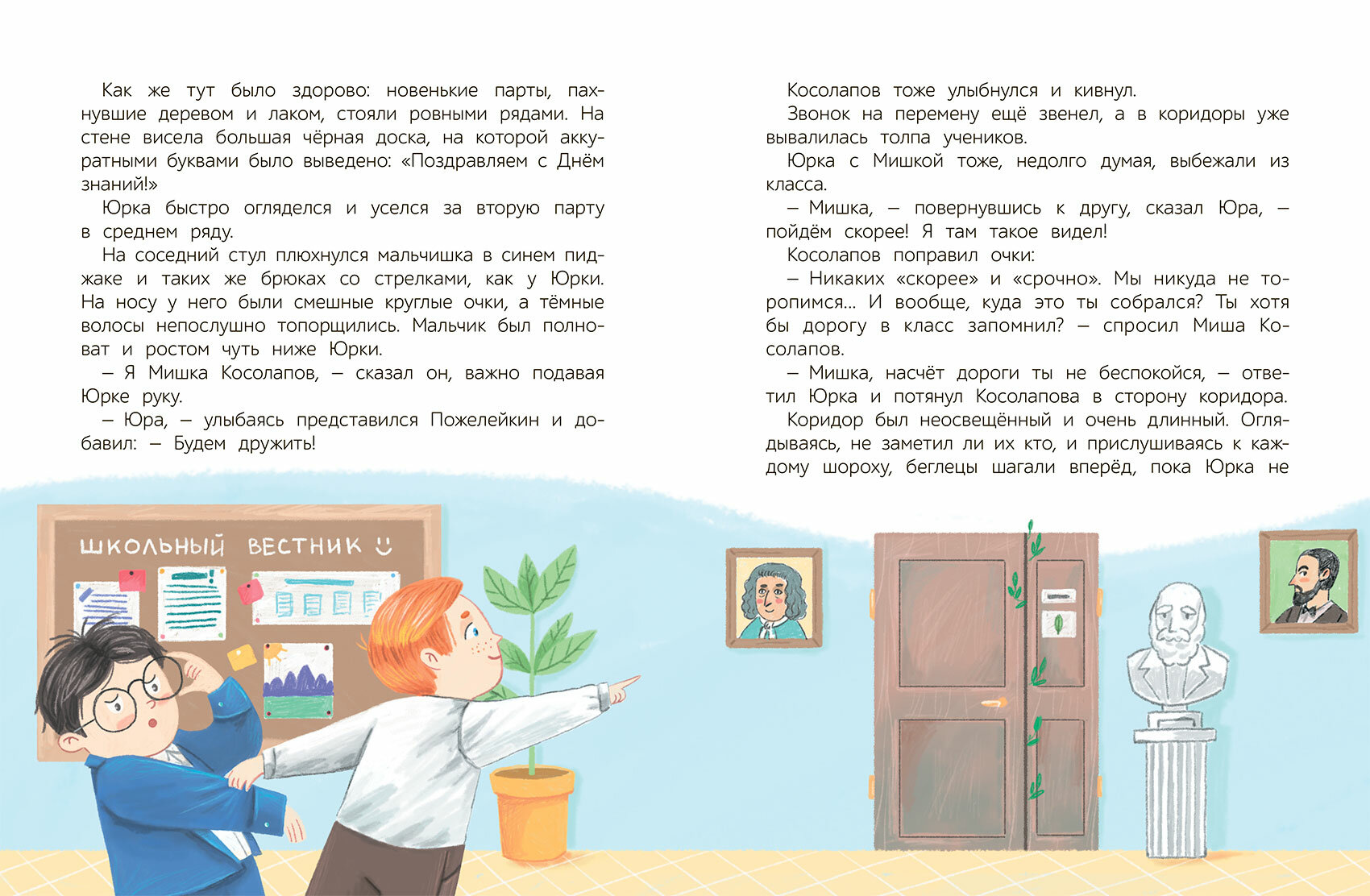 Первый класс – время волнительных открытий и весёлых приключений, особенно, если у тебя есть настоящий школьный друг. Юрке Пожелейкину повезло, у него такой друг с первого учебного дня появился. Да ещё какой! С Мишкой Косолаповым не пропадёшь: с ним можно и в путешествие к динозаврам отправиться, и в буфете за себя постоять, и собачий концерт на уроке музыки устроить, и «кота учёного» в класс пронести. И, самое главное, с лучшим другом так здорово фантазировать обо всём на свете!