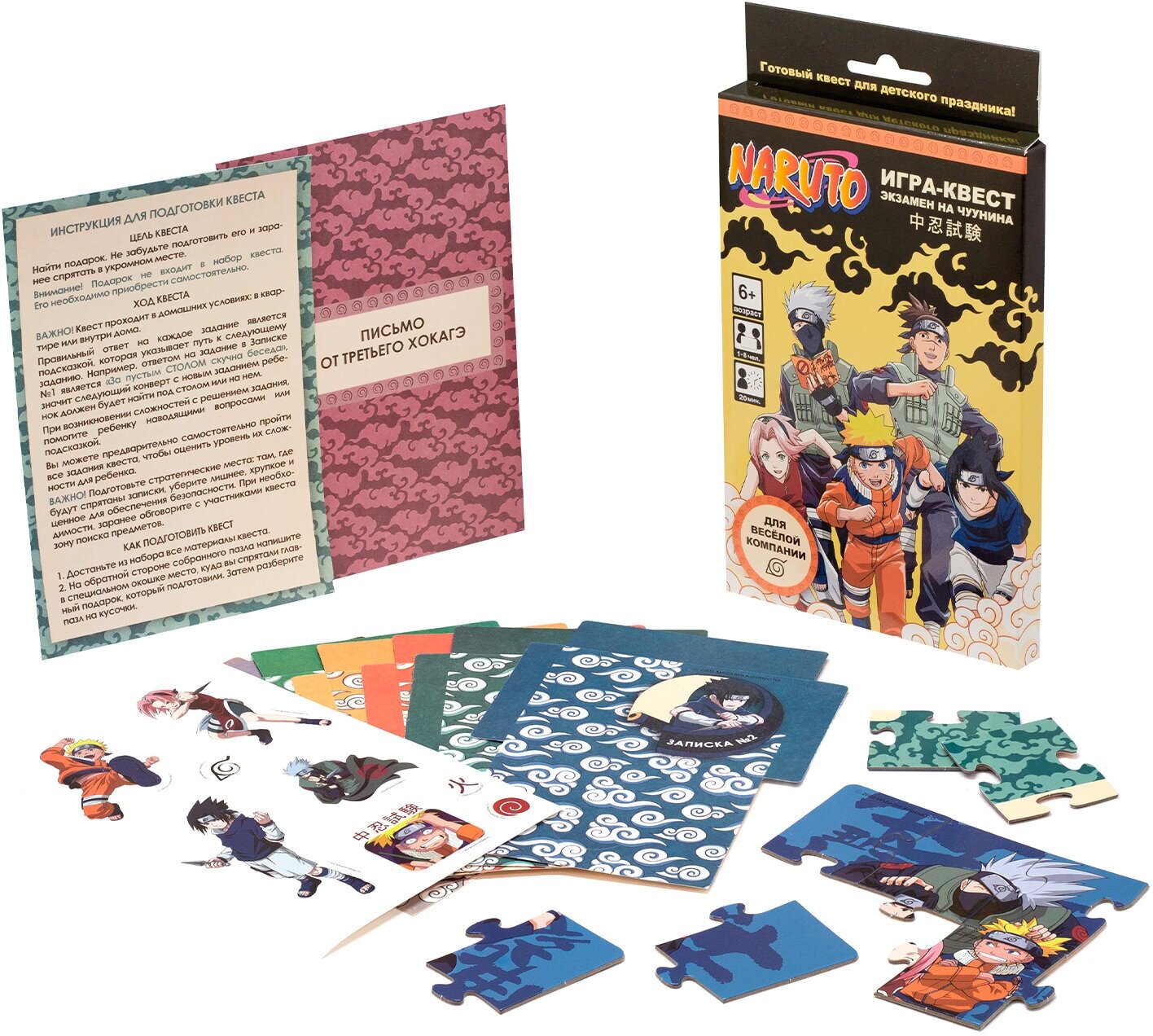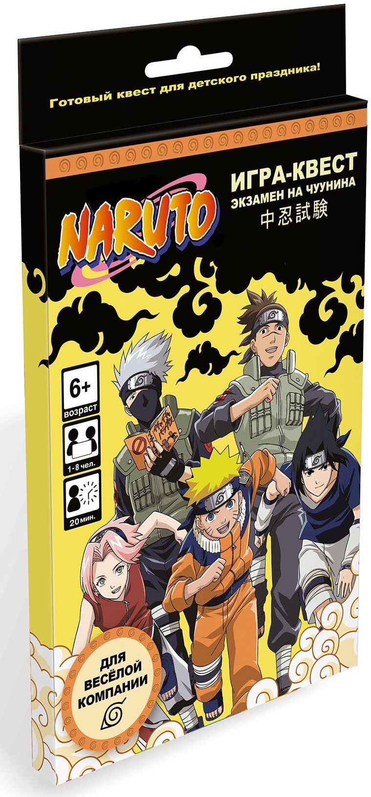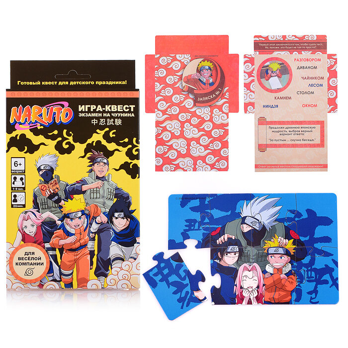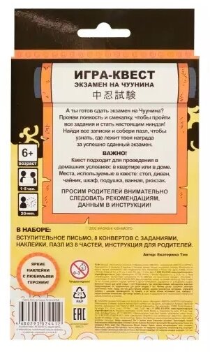 Игра представляет собой квест, в котором участникам предстоит пройти ряд испытаний, чтобы стать Чуунином. В комплекте идут карточки из картона, которые помогут создать атмосферу и добавить интереса к игре.
