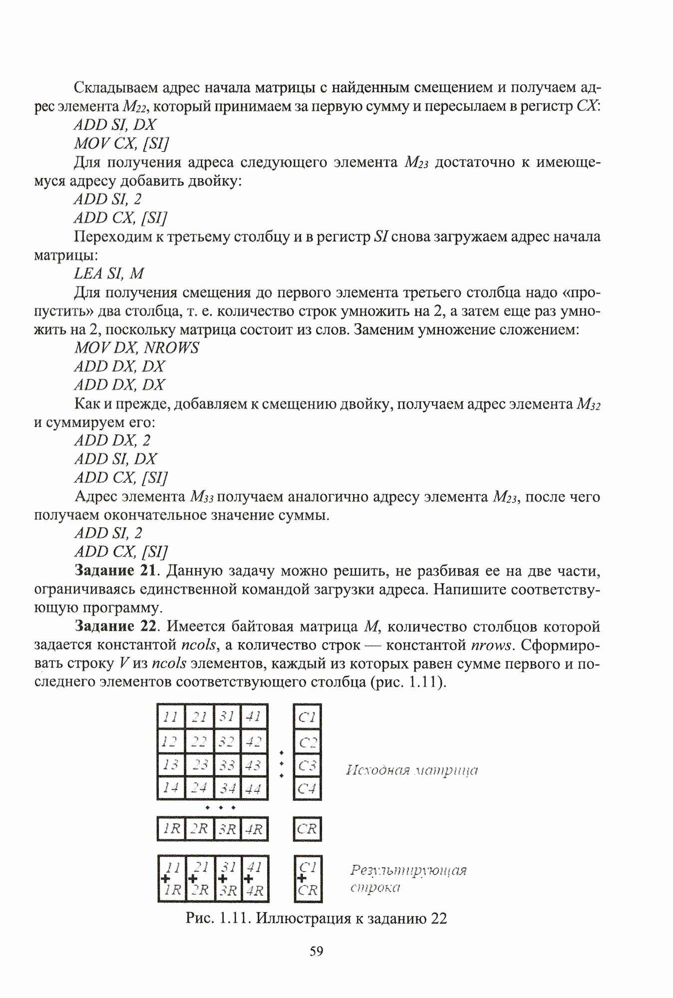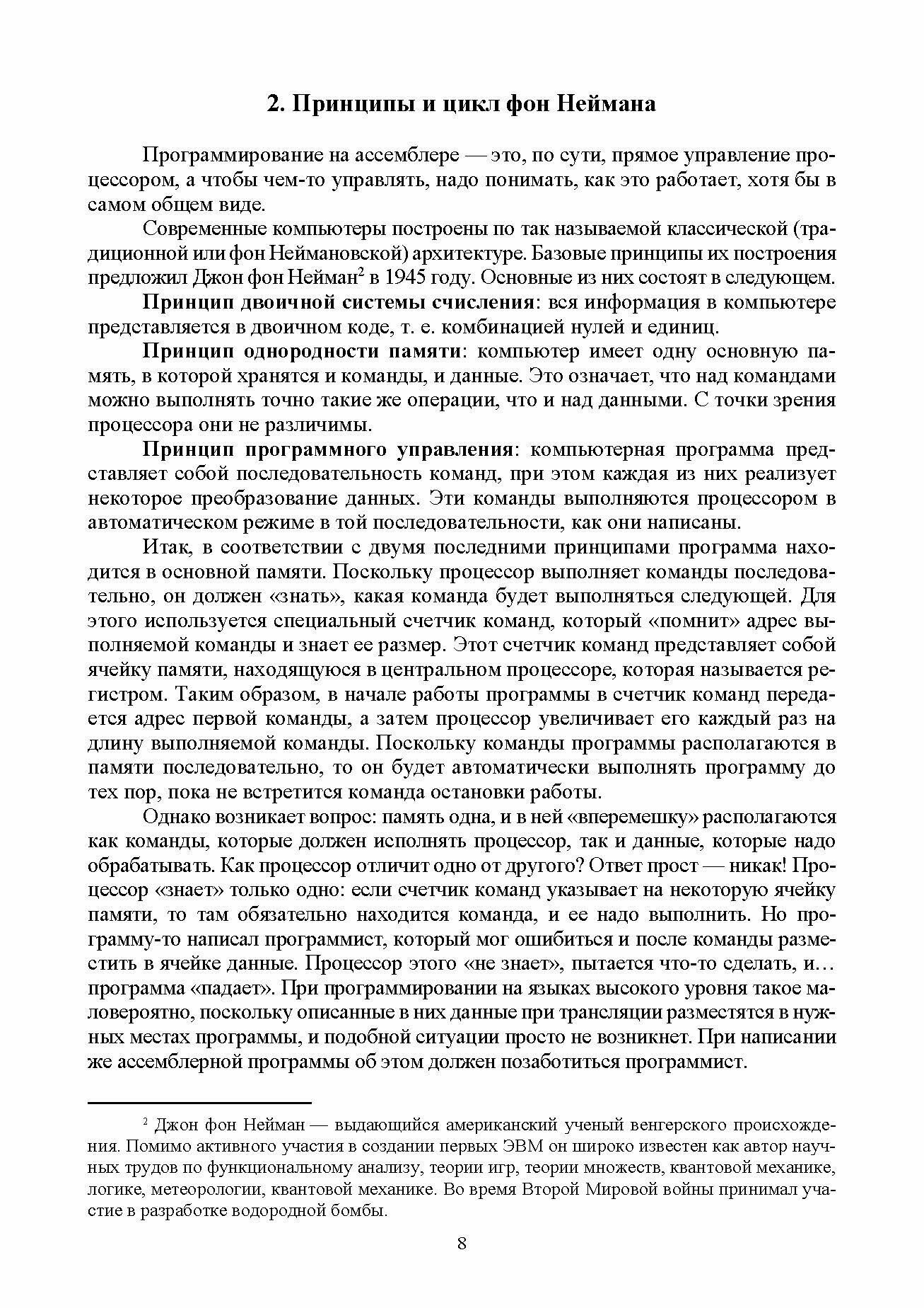 Учебное пособие является введением в язык ассемблера и включает в себя теоретические сведения и большое количество практических заданий. Оно предназначено для студентов высших учебных заведений, подготовка которых предполагает изучение дисциплин, связанных с низкоуровневым программированием и архитектурой компьютера.