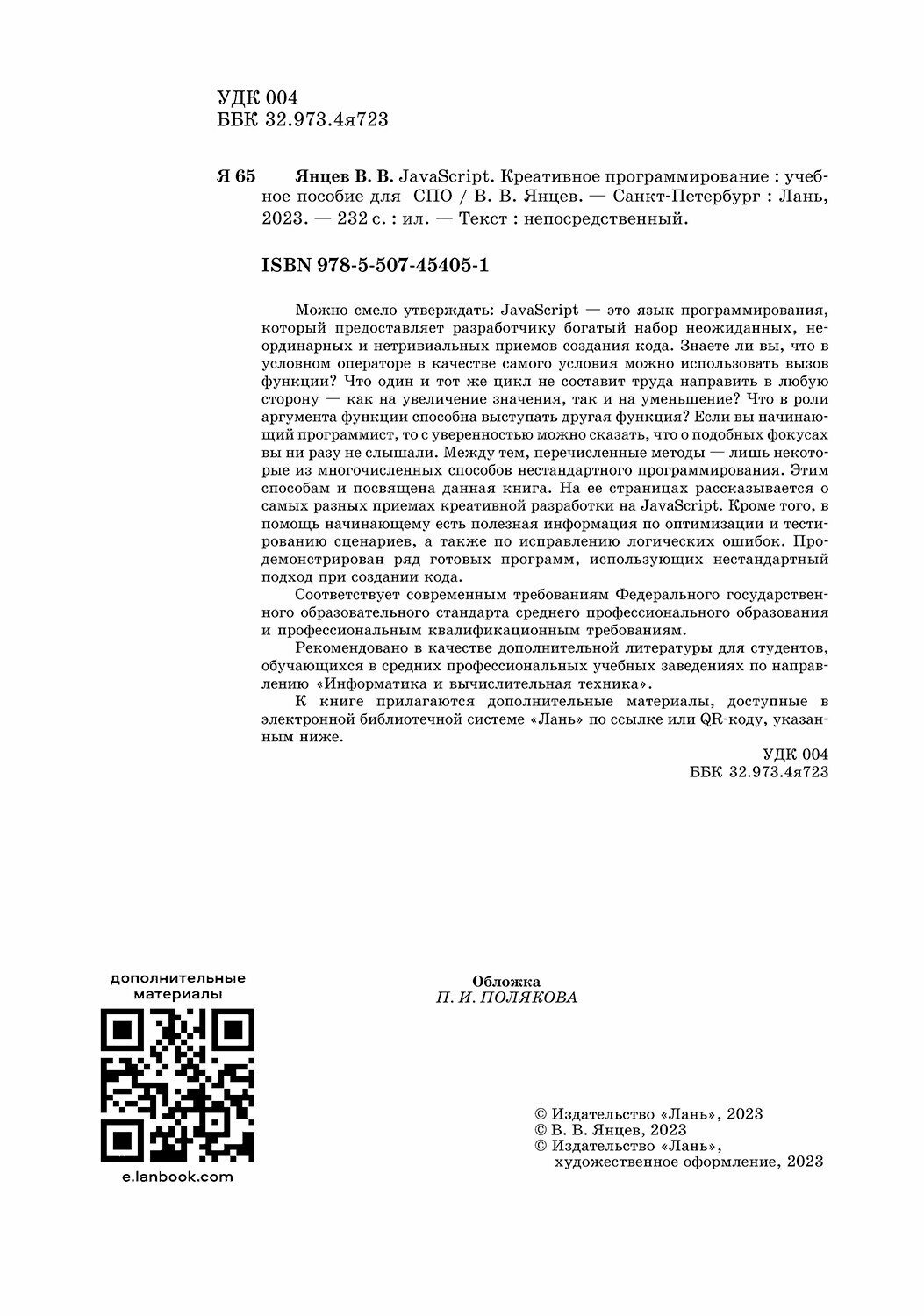 JavaScript. Креативное программирование. Учебное пособие для СПО (В. В. Янцев); Издательство ЛАНЬ, 2024