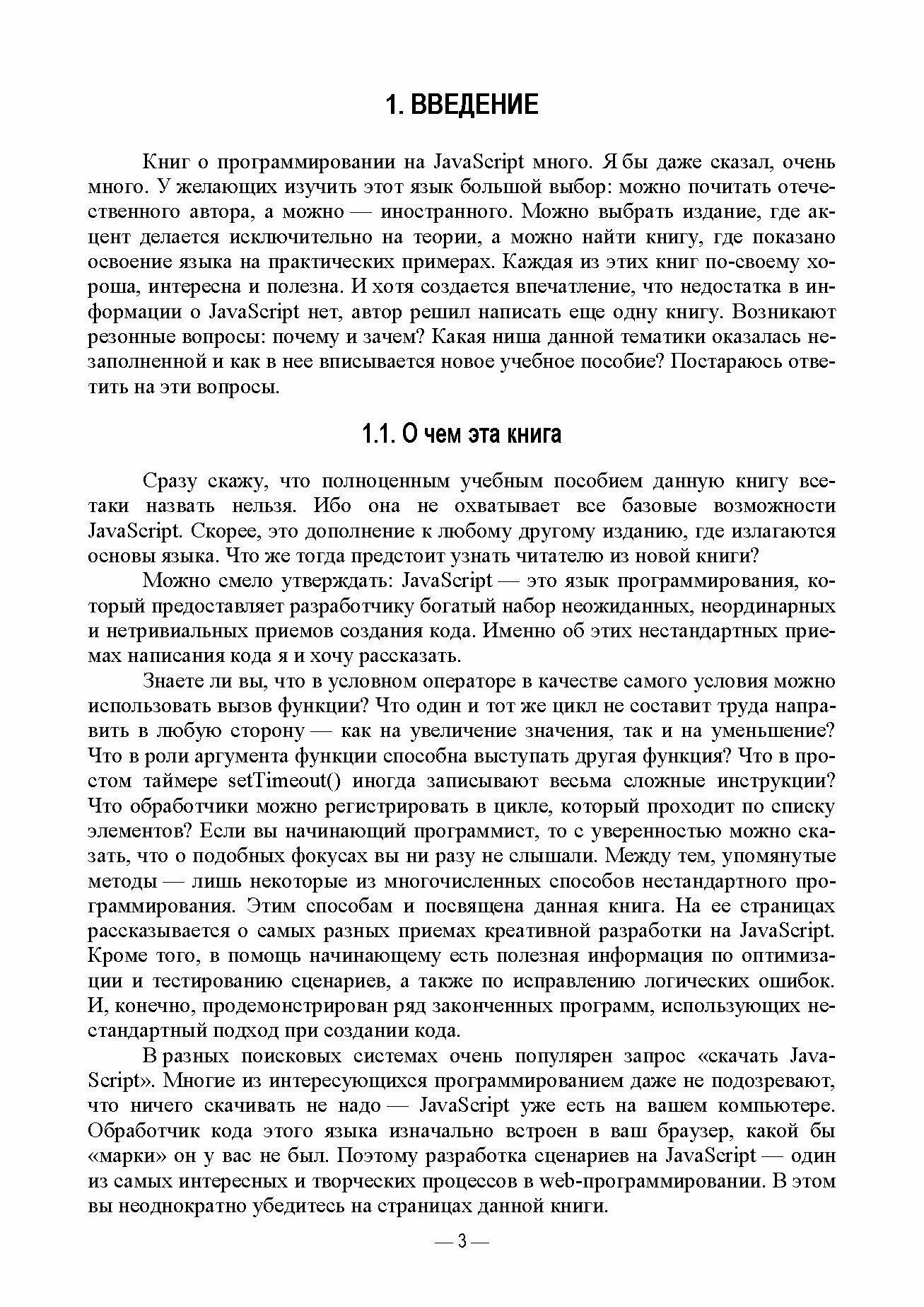Можно смело утверждать: JavaScript — это язык программирования, который предоставляет разработчику богатый набор неожиданных, неординарных и нетривиальных приемов создания кода. Знаете ли вы, что в условном операторе в качестве самого условия можно использовать вызов функции? Что один и тот же цикл не составит труда направить в любую сторону — как на увеличение значения, так и на уменьшение? Что в роли аргумента функции способна выступать другая функция? Если вы начинающий программист, то с уверенностью можно сказать, что о подобных фокусах вы ни разу не слышали. Между тем, перечисленные методы — лишь некоторые из многочисленных способов нестандартного программирования. Этим способам и посвящена данная книга. На ее страницах рассказывается о самых разных приемах креативной разработки на JavaScript. Кроме того, в помощь начинающему есть полезная информация по оптимизации и тестированию сценариев, а также по исправлению логических ошибок. Продемонстрирован ряд готовых программ, использующих нестандартный подход при создании кода.