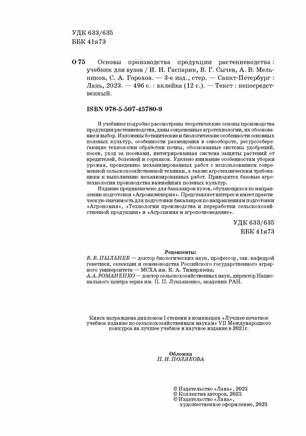 Основы производства продукции растениеводства. Учебник для вузов (Гаспарян Ирина Николаевна, Сычев Виктор Гаврилович, Мельников Андрей Валерьевич); Лань, 2023