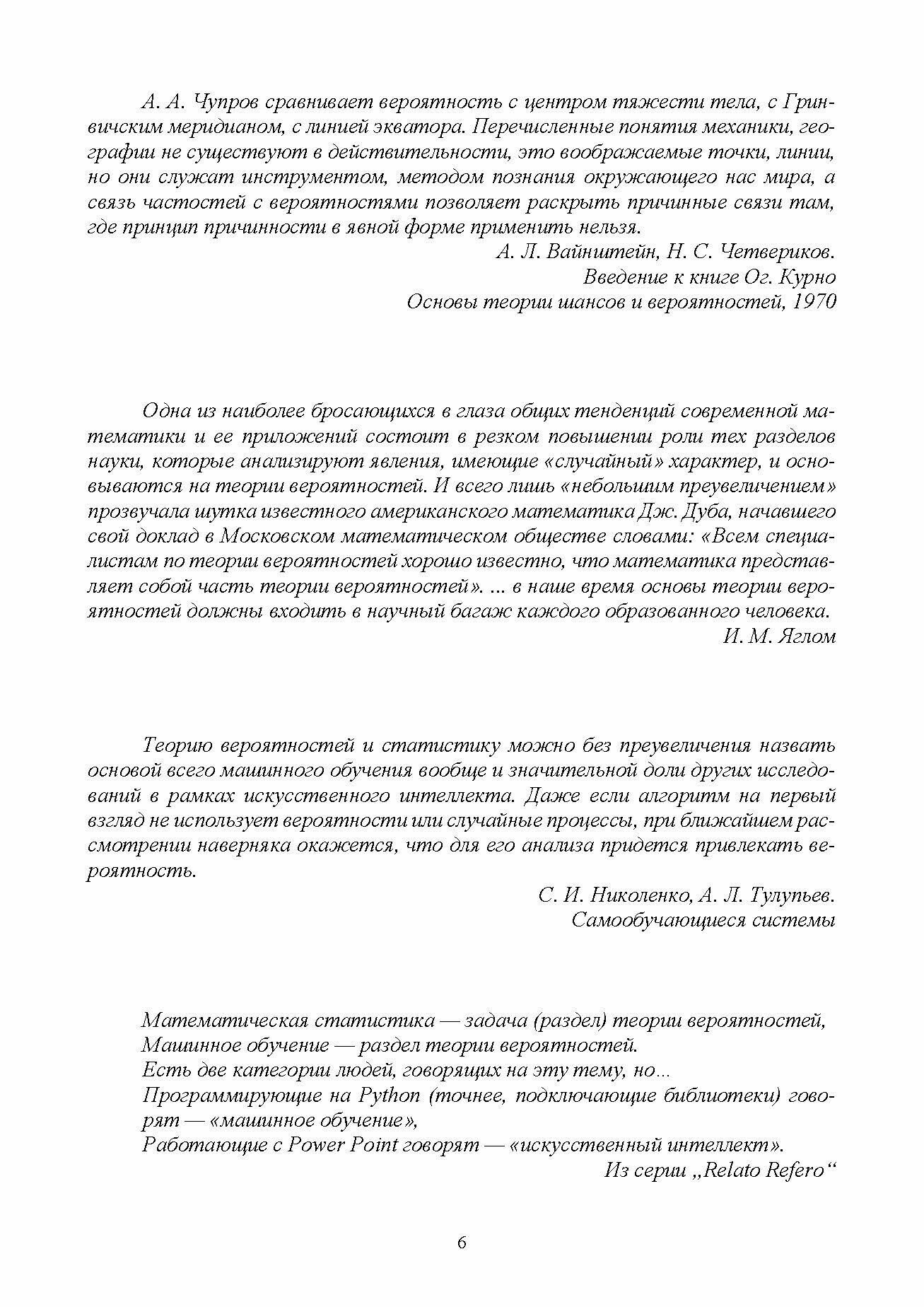 Рассмотрены основные вопросы теории вероятностей и математической статистики в соответствии с программой подготовки студентов, обучающихся в вузах. Для углубленного изучения курса приведены приложения теории вероятностей в компьютерных науках (computer science). Содержание книги предполагает возможность заложить базу для изучения прикладной статистики (анализа данных) и науки о данных, поэтому особое внимание уделяется содержательному смыслу (геометрическому, физическому, логическому) вводимых понятий.