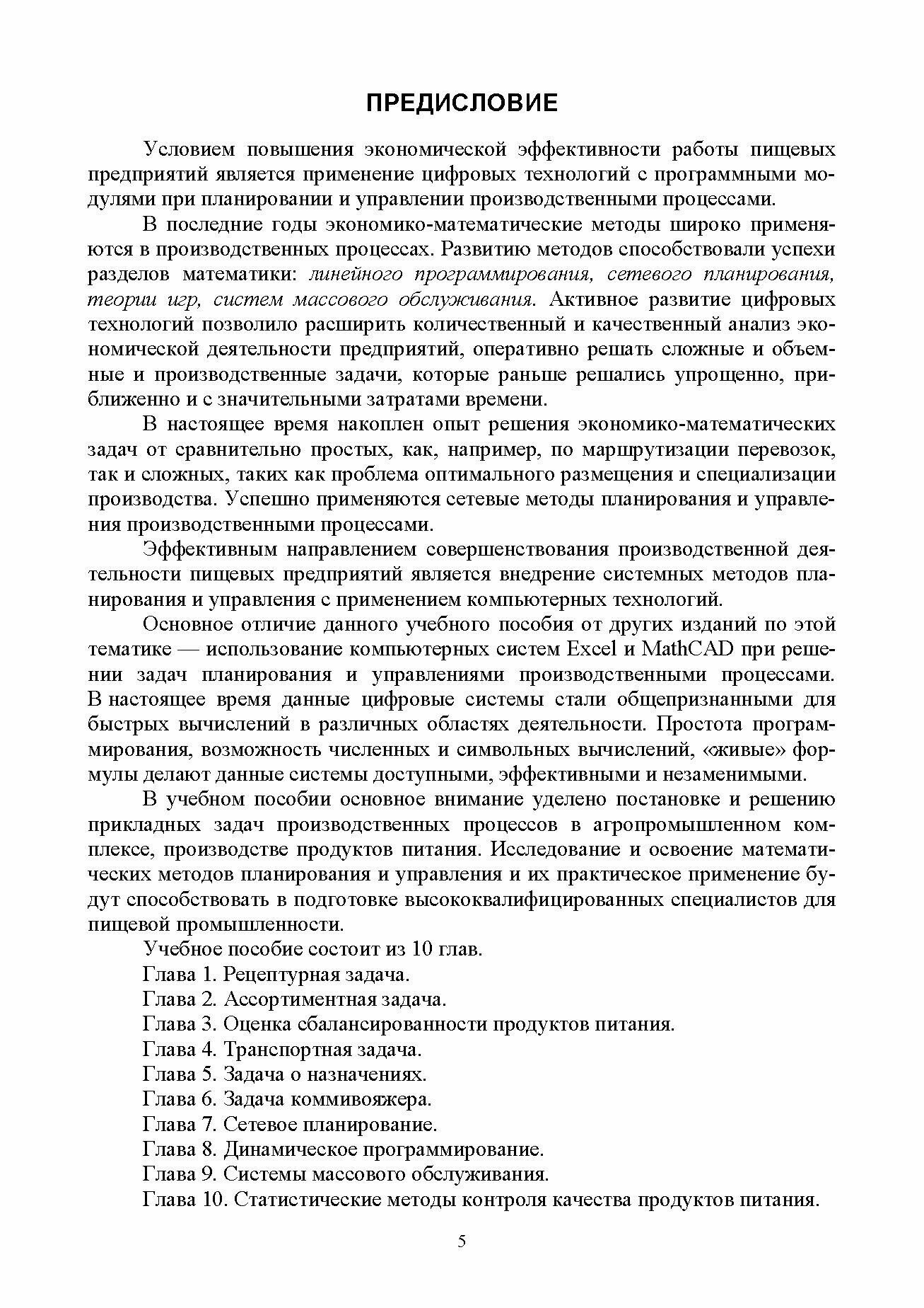 В учебном пособии рассмотрены классические задачи линейного программирования, системы массового обслуживания, статистического анализа качества продуктов питания и методологии оценки сбалансированности продуктов питания. Теоретическая часть пособия дополняется детально разобранными практическими примерами. Приводятся примеры решения прикладных задач с использованием цифровых систем — Excel, MathCAD.