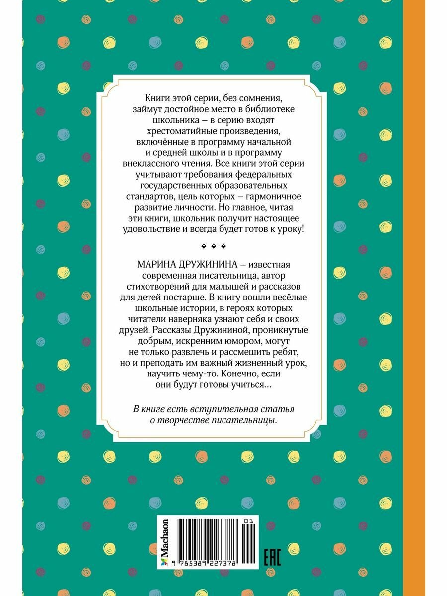 Марина Дружинина - известная современная писательница, автор стихотворений, сказок для малышей и рассказов для детей постарше. В книгу вошли весёлые истории о мальчишках и девчонках, об их школьных буднях, о том, чем они интересуются, о чём мечтают, чем занимаются в свободное время... Рассказы Дружининой, проникнутые добрым и искренним юмором, могут не только развлечь и рассмешить юных читателей, но и преподать им важный жизненный урок, научить чему-то. Если, конечно, ребята будут готовы учиться…