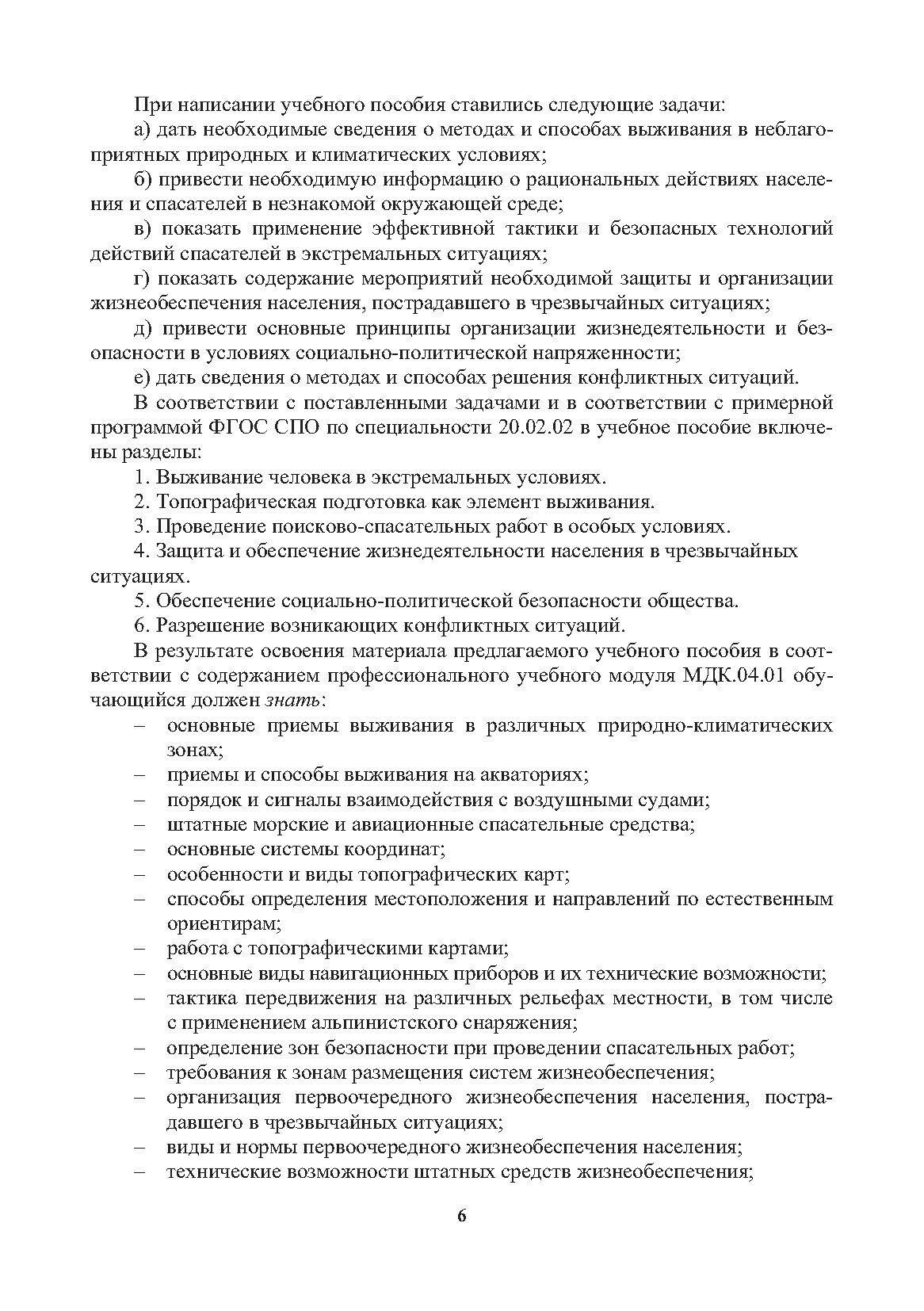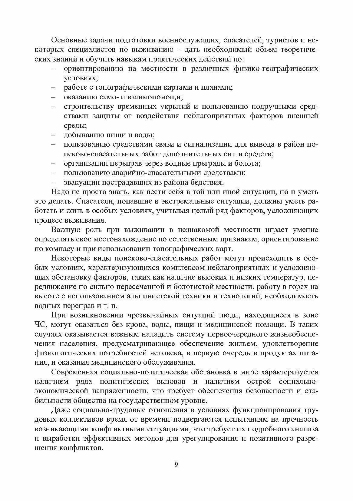 Содержится информация о способах выживания человека в экстремальных ситуациях природного и техногенного характера. Освещаются вопросы топографической подготовки, способы ориентирования в окружающей среде и работа с топографическими картами. Приводятся сведения о безопасных действиях спасателей в особых условиях проведения поисково-спасательных работ. Даются описания мероприятий обеспечения безопасности и первоочередного жизнеобеспечения населения при чрезвычайных ситуациях. Содержится информация об организации и обеспечении безопасности в условиях социально-политической напряженности. Приводятся сведения о методах и способах разрешения конфликтных ситуаций.