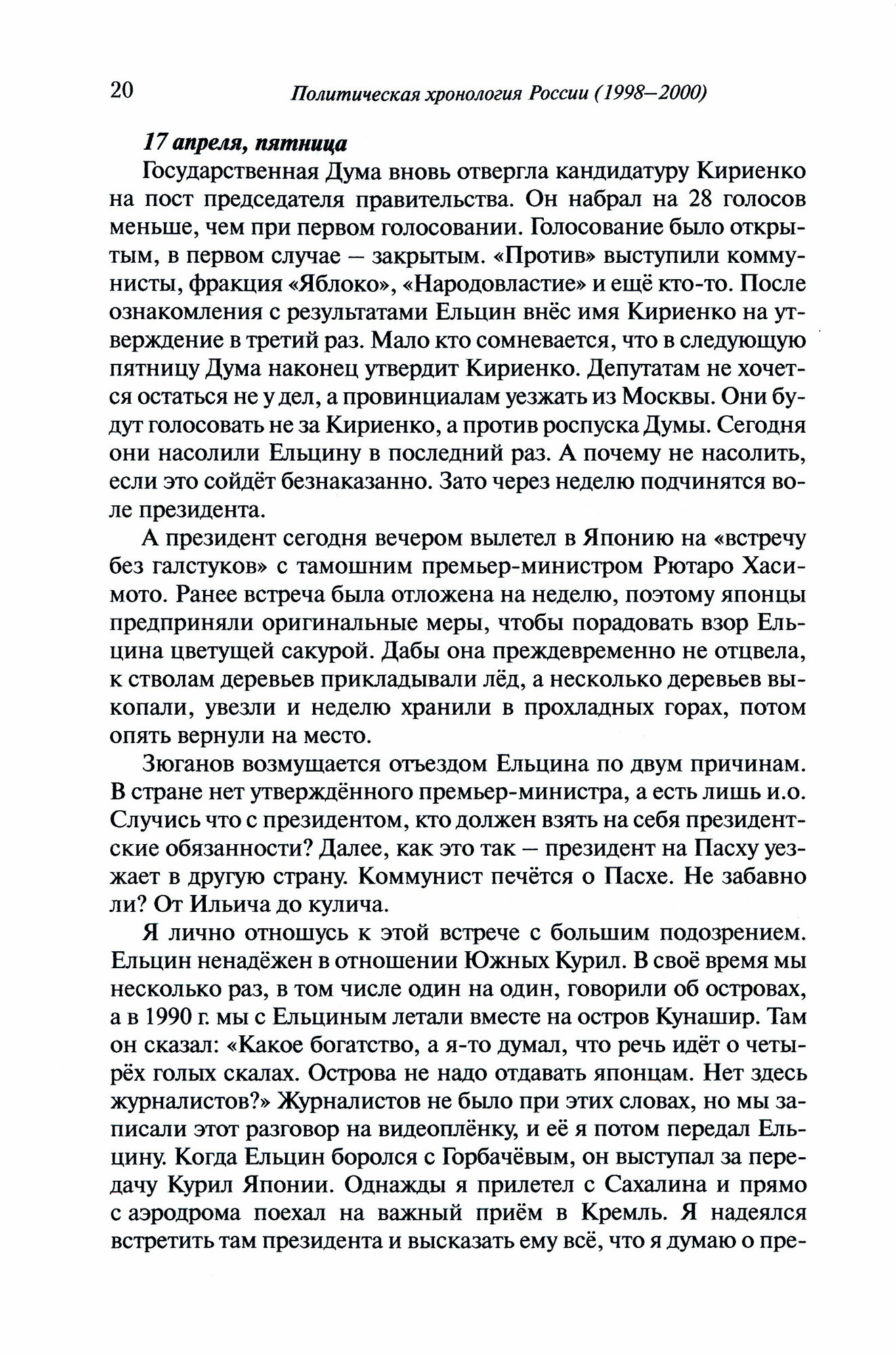 Вниманию читателя представлены воспоминания В.П. Фёдорова (1939-2021), известного российского учёного, члена-корреспондента РАН, государственного деятеля, писателя и поэта, изложенные в виде дневниковых записей за 1998-2000 гг. Книга является уникальным слепком своего времени. День за днём автор описывает и комментирует политическую и социально-экономическую жизнь России в один из самых трудных периодов её истории. Канва событий включает описание России перед дефолтом 1998 г. и после него, череду смены правительств и премьер-министров, приход на пост президента страны В.В. Путина, "вторую" Чеченскую войну, перипетии отношений между ветвями власти. Значительная часть книги посвящена вопросам внешней политики. Огромный научный и государственный опыт автора, обладание информацией из "первый уст" и "первых рук" максимально приближают читателя к сути событий, раскрывают их внутренние пружины и роль личности в истории. Книга написана человеком чести, патриотом своей страны.