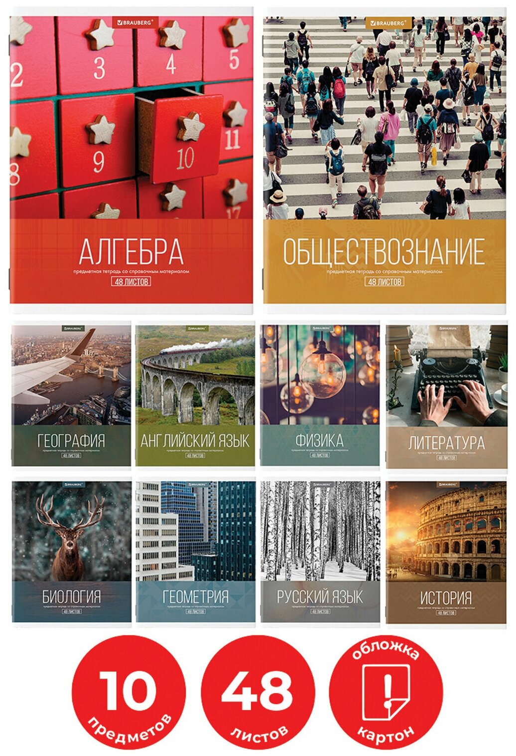В комплекте 10 тетрадей: Обществознание, Алгебра, Английский язык, Биология, География, Геометрия, Физика, История, Литература (в линию), Русский язык (в линию). Внутренний блок плотностью 60 г/м2. Белая бумага 100% белизны с красными полями. 48 листов. Формат А5. На скрепке. Прямые углы. Длина: 205 мм. Ширина: 165 мм. Артикул производителя: 404025.