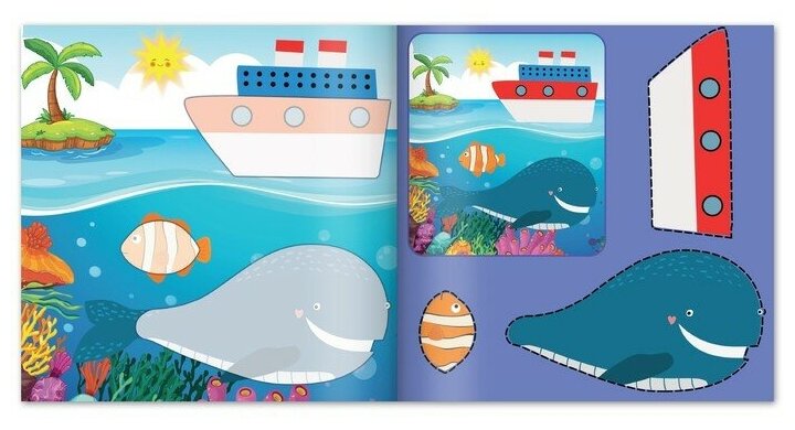 Чтобы сориентироваться, как наклеить элементы на картинку, на каждом сюжетном развороте дан пример.