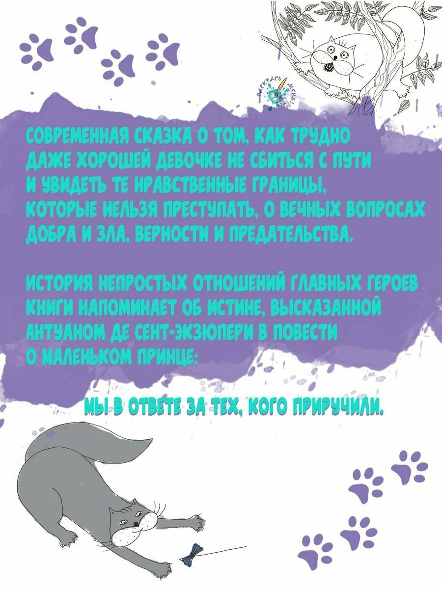Современная сказка о том, как трудно даже хорошей девочке не сбиться с пути и увидеть те нравственные границы, которые нельзя преступать, о вечных вопросах добра и зла, верности и предательства. История непростых отношений главных героев книги напоминает об истине, высказанной Антуаном де Сент-Экзюпери в повести о Маленьком принце: "Мы в ответе за тех, кого приручили".