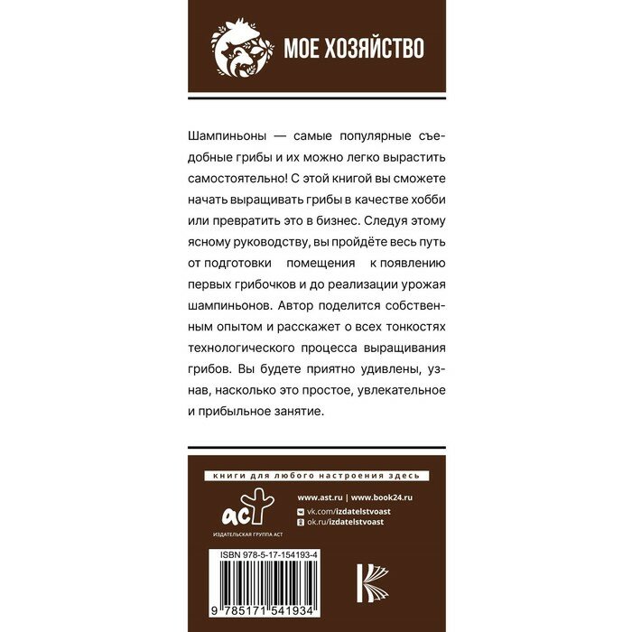 Шампиньоны — самые популярные съедобные грибы и их можно легко вырастить самостоятельно! С этой книгой вы сможете начать выращивать грибы в качестве хобби или превратить это в бизнес. Следуя этому ясному руководству, вы пройдёте весь путь от подготовки помещения к появлению первых грибочков и до реализации урожая шампиньонов. Автор поделится собственным опытом и расскажет о всех тонкостях технологического процесса выращивания грибов. Вы будете приятно удивлены, узнав, насколько это простое, увлекательное и прибыльное занятие.