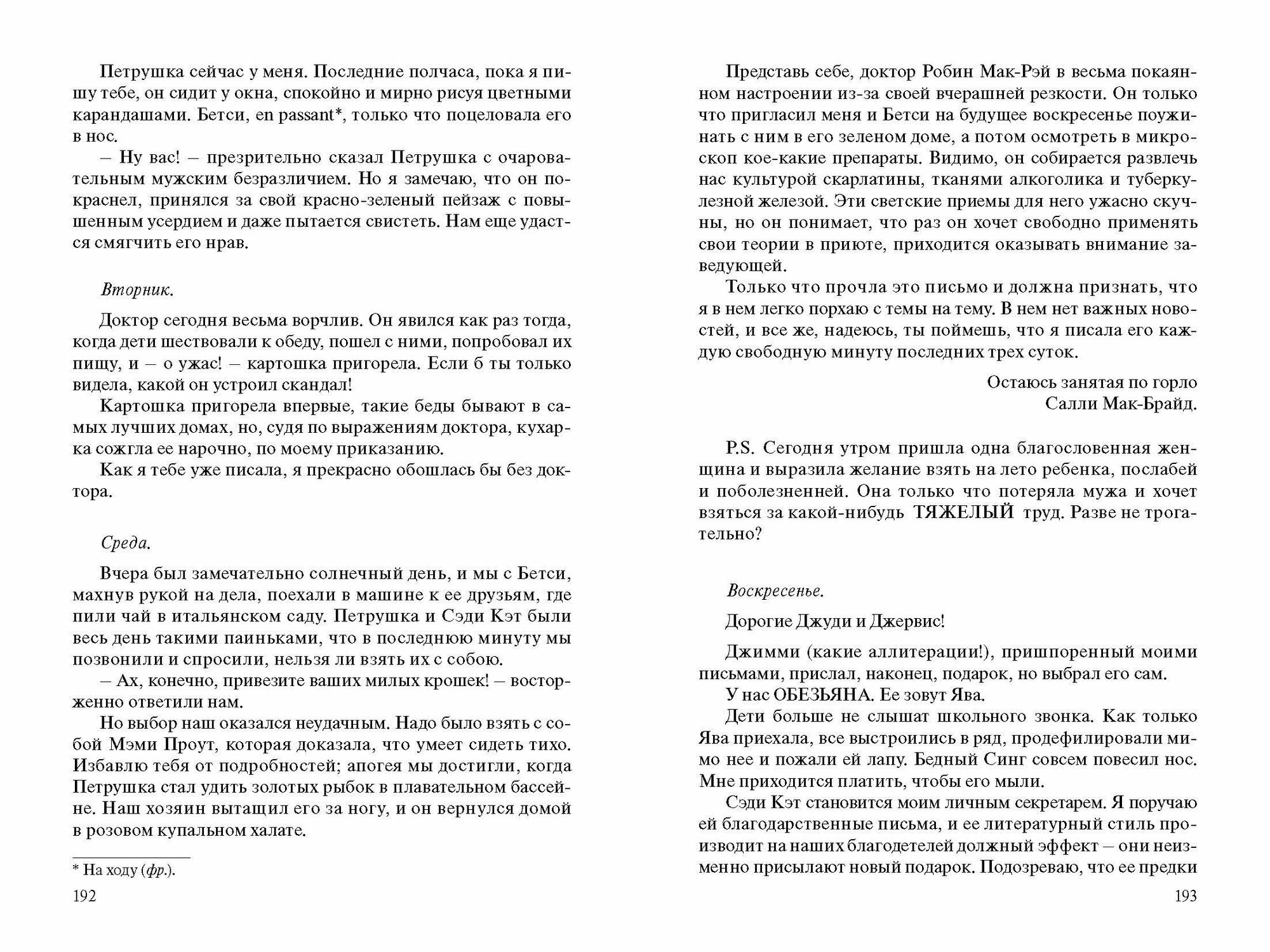 Джин Уэбстер создает определенную атмосферу сказочности и обаяния, которая заставляет читателя поверить в сказку. Ее романы наполнены чувствами и любовью, которая возможна даже с самыми непонятливыми и неприятными людьми. Героини поднимают настроение и заставляют улыбаться, даже когда все идет не так, как хотелось бы.