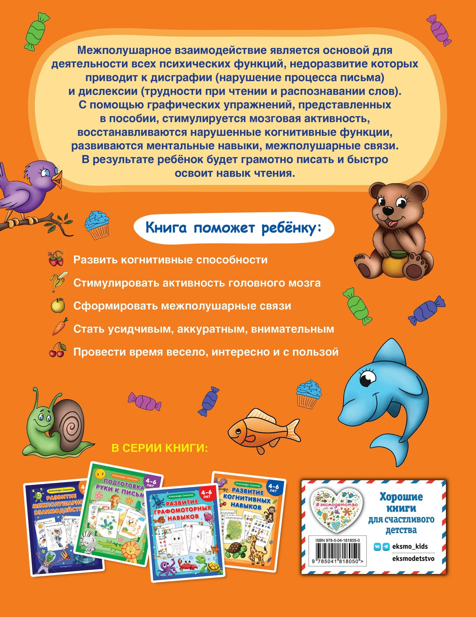 Нарушение чтения и письма стоит на первом месте среди проблем современной школы. Дисграфия — нарушение процесса письма: ученик повторяет одни и те же ошибки, заменяет или переставляет буквы и слоги. При дислексии ребёнку трудно даётся чтение, ему сложно распознавать слова и писать под диктовку. С этими нарушениями можно и нужно работать. Цель пособия — развитие когнитивных способностей и, как следствие, профилактика дисграфии и дислексии. В основу книги положен нейропсихологический подход. С помощью определённых упражнений стимулируется активность головного мозга, развиваются ещё не сформированные или нарушенные когнитивные функции, развиваются ментальные навыки. Кроме того, в процессе работы с пособием дошкольник подготовит руку к письму, научится сосредотачиваться на конкретной задаче, станет более внимательным и усидчивым. А красочные иллюстрации помогут заинтересовать ребёнка и сделают процесс обучения более эффективным.
