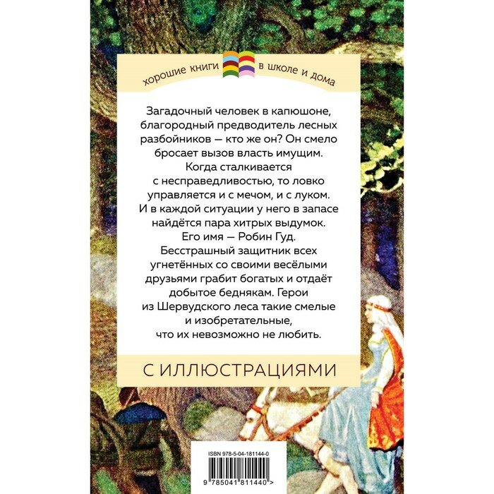 Замечательная книга для внеклассного чтения о легендарном и благородном Робин Гуде - предводителе разбойников. Моим детям (10 и 5 лет) истории о Робине очень понравились. Читали и слушали с удовольствием. Огромный плюс - наличие иллюстраций. Можно рассматривать их и обсуждать. Отдельно отмечу хороший размер шрифта, очень удобный для чтения и красивое оформление обложки книги.