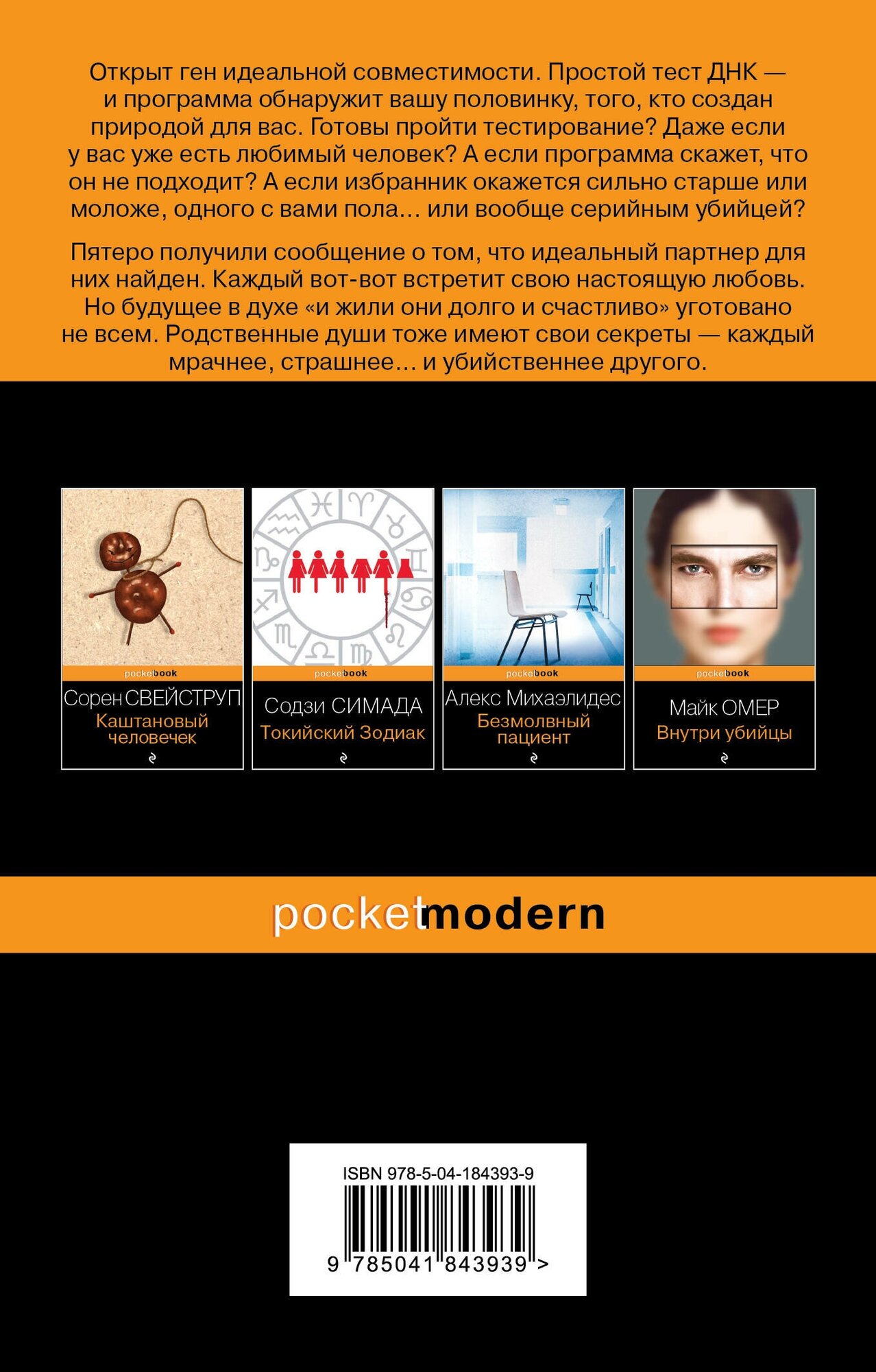 Отличный психологический триллер с любопытным детективным сюжетом , необычная , глубокая книга. Изобретен ген совместимости , у каждого где-то существует идеально подходящая половинка. В книге показаны истории пяти героев , получивших сообщения о идеальных партнёрах , каждая история оригинальна , отношения в парах раскрыты неожиданно. Возможно , сюжетных линий могло бы быть и меньше.
