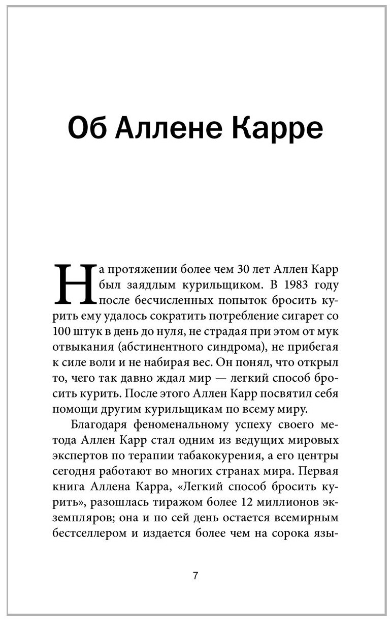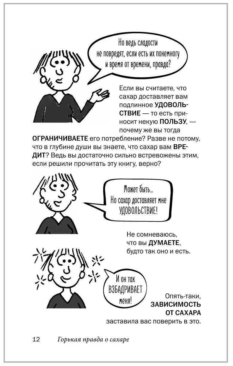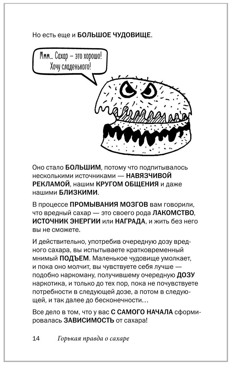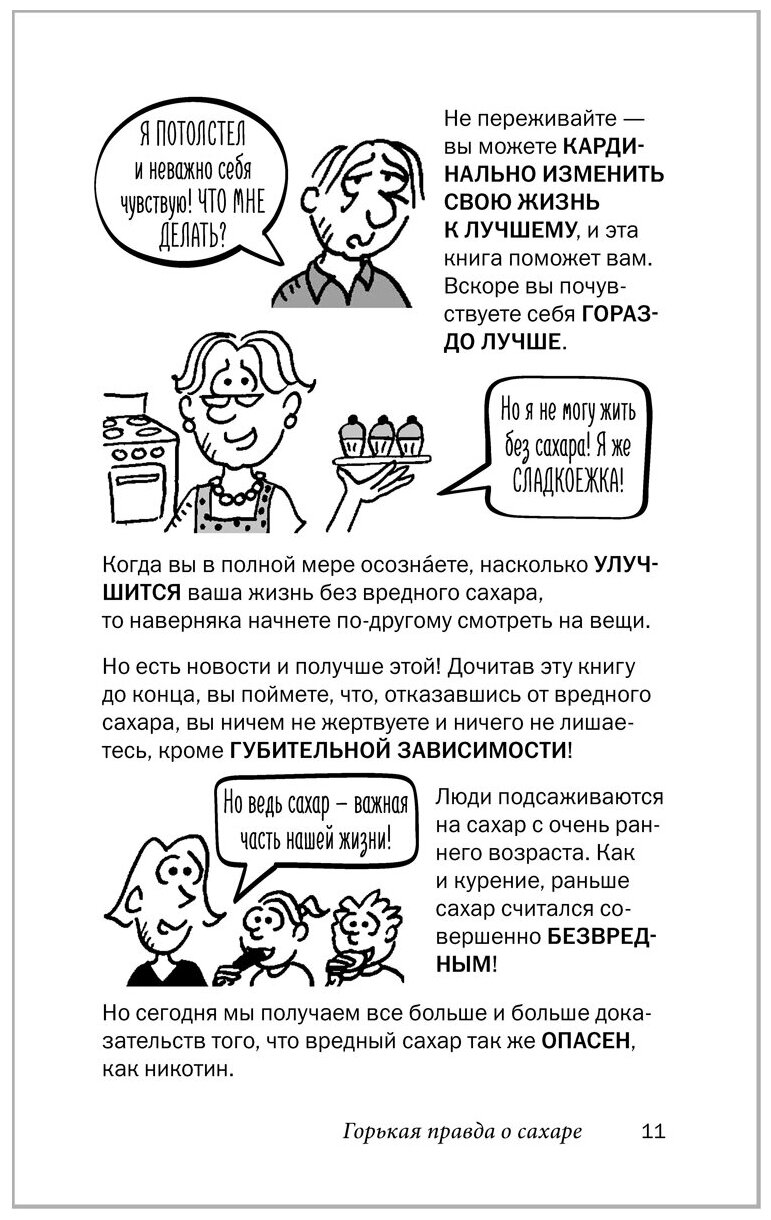 Сегодня мир охватила настоящая эпидемия ожирения и диабета 2-го типа. Современная медицина винит в этом жирную и высококалорийную пищу, оставляя без внимания первопричину всех этих бед — зависимость от сахара и так называемых «пустых» углеводов. Перенос фокуса внимания с сахара на жиры стоил человечеству миллионов потерянных жизней и позволил производителям продуктов питания, напитков и лекарств десятилетиями набивать карманы деньгами и навязывать нам свою продукцию, используя самые грязные приемы табачной индустрии. Именно зависимость от сахара, которая формируется у нас в первые годы жизни, не позволяет нам отказаться от нездоровых привычек в еде и поддерживать вес тела в норме. Это иллюстрированное практическое руководство поможет вам навсегда избавиться от такой зависимости — безболезненно, без волевых усилий и мук отвыкания, без диет и самоограничений, ничем не жертвуя и ничего не лишаясь. Вы сможете есть столько любимой еды, сколько захотите и когда захотите, будете наслаждаться едой и при этом оставаться здоровыми и стройными и в полной мере получать удовольствие от жизни. «Легкий способ» Аллена Карра стал самым успешным методом избавления от никотиновой зависимости и теперь широко используется для исцеления самых разных расстройств и зависимостей, от алкоголизма и наркомании до игромании и аэрофобии. Этот метод уже помог миллионам людей изменить свою жизнь к лучшему. Он поможет и вам. Прочитайте эту книгу, избавьтесь от зависимости от сахара и переработанных и крахмалистых углеводов, станьте свободными и наслаждайтесь жизнью! Эта книга хорошо дополняет две другие книги Аллена Карра — «Полезный сахар, вредный сахар» и «Легкий способ избавиться от эмоционального переедания». Иллюстрации для книги создала художница Бев Эйсбетт, автор иллюстраций для книг «Легкий способ бросить курить в картинках» и «Легкий способ бросить курить для женщин в картинках».