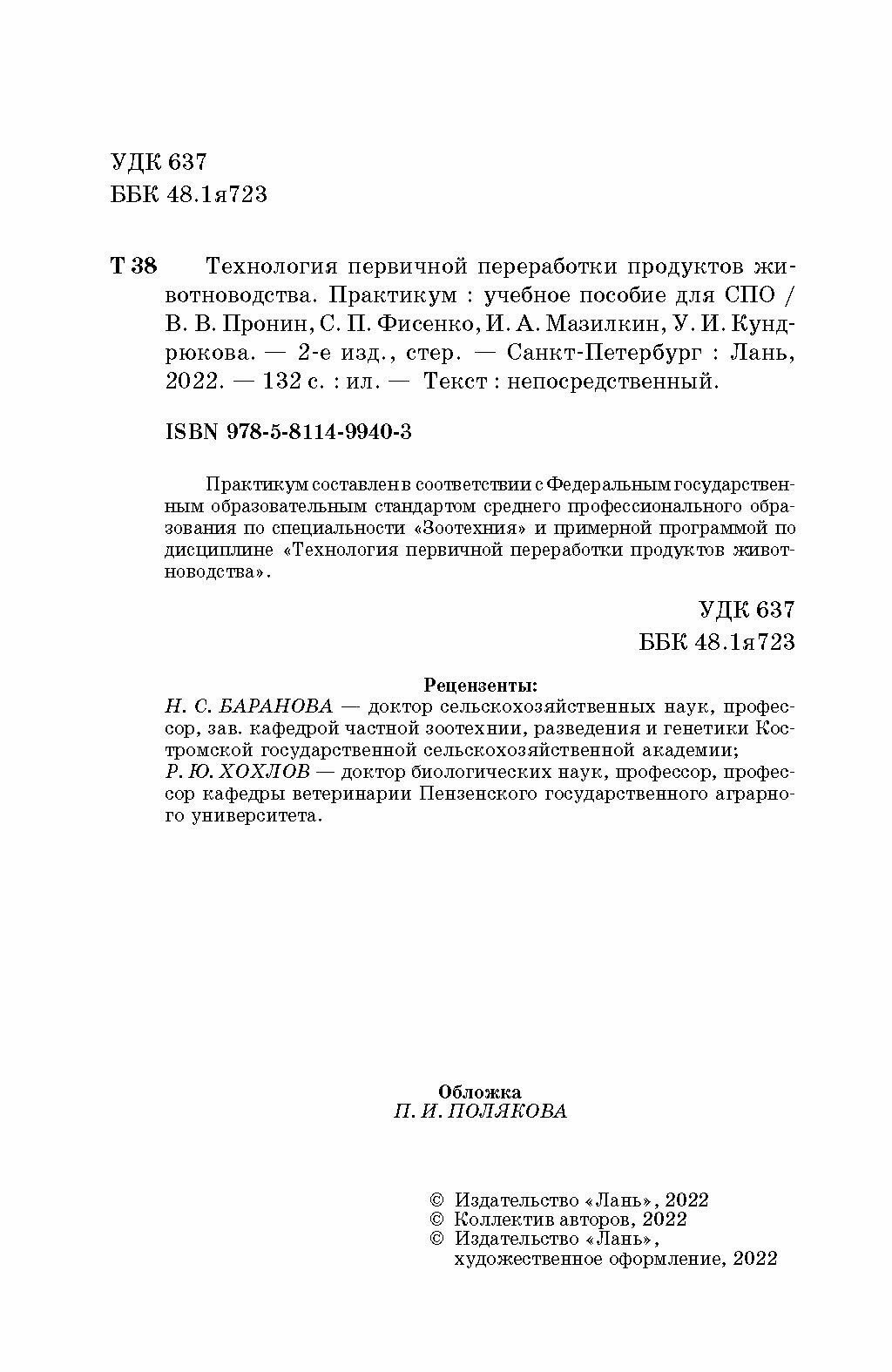 Технология первичной переработки продуктов животноводства. Практикум (Пронин Валерий Васильевич, Фисенко Светлана Павловна, Мазилкин Игорь Александрович); Лань, 2022