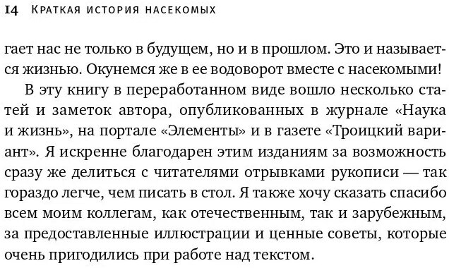 Мы отмахиваемся от мух и комаров, сражаемся с тараканами, обходим стороной муравейники, что уж говорить о вшах! Только не будь вшей, человек остался бы волосатым, как шимпанзе. Да и вообще в отсутствие насекомых позвоночные никогда не вышли бы на сушу, так как им там нечем было бы питаться. Да, о насекомых есть немало книг, но эта первая, которая рассказывает о них с точки зрения их становления и исторического развития. Палеоэнтомология — не математика, многое в этой стремительно развивающейся науке строится на гипотезах и интерпретациях, но благодаря появлению все новых данных и исследовательских методов ученые могут поделиться с нами захватывающими открытиями и догадками, добавляя очередные фрагменты в картину мира. И автор делает это увлеченно и талантливо.