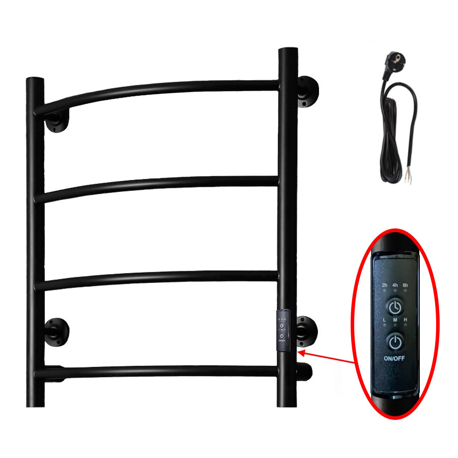 Электрический полотенцесушитель Тругор Пэксп5/6050черныйВГП. Благодаря оптимальному химическому составу, современным промышленным технологиям и применяемому материалу сталь изделие отличается высокой коррозионной стойкостью при эксплуатации в органических кислотных и прочих умеренно агрессивных средах, комплект скрытого подключения; нагревательный кабель; выключатель с таймером и терморегулятором; шнур электропитания с вилкой; телескопический держатель - 4 шт.