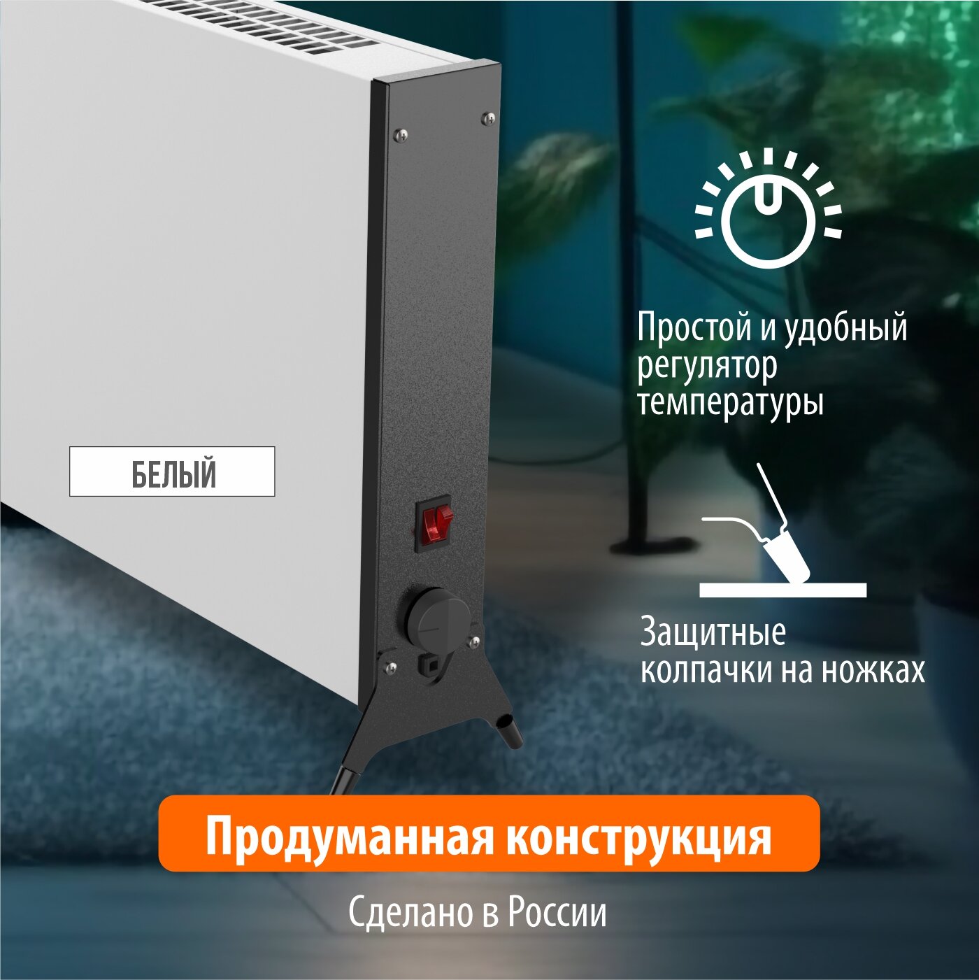 \r\nКонвектор имеет возможность регулировки степени нагрева воздуха в помещении за счет изменения периодов времени нагрева и остывания конвектора. Плавная регулировка необходимой степени нагрева (температуры воздуха) осуществляется биметаллическим термостатом. Неравномерность нагрева корпуса конвектора является конструктивной особенностью и не влияет на процесс нагрева воздуха в помещении.